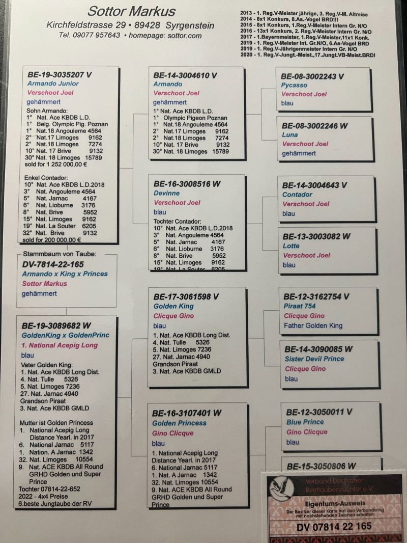 Oryginalny gołąb Markusa Sottora. Jest wnuczką dwóch super gołębi Armando i Golden Princess. Samiczka o super budowie, jasnej barwie oka i świetnie leży w rękach. W fazie końcowego pierzenia