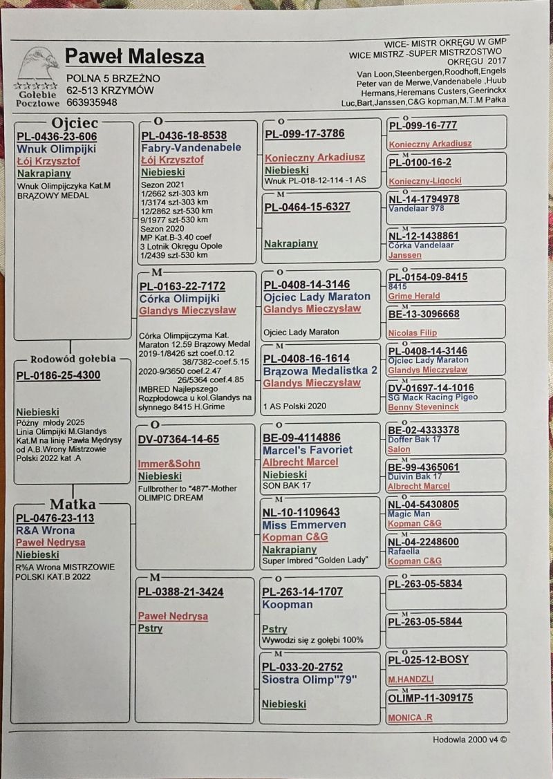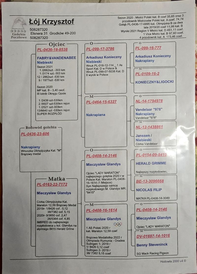 Młody gołąbek z super pochodzeniem .Linia Olimpijska M.Glandys Kat.Maraton od Krzysztof Łój na linię Pawła Mędrysy od Mistrzów Polski 2022 Kat.B R.A.Wrona.