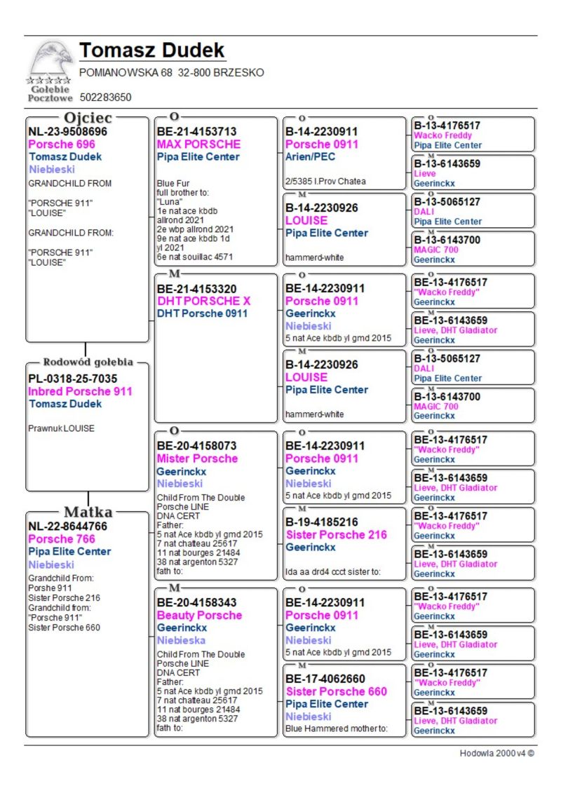 Mamy Państwu do zaoferowania gołębia 7035, który jest inbredem Porsche 911, a także Louise. Możliwość wykonania badań DNA na koszt kupującego. Więcej informacji pod numerem 502 283 650.