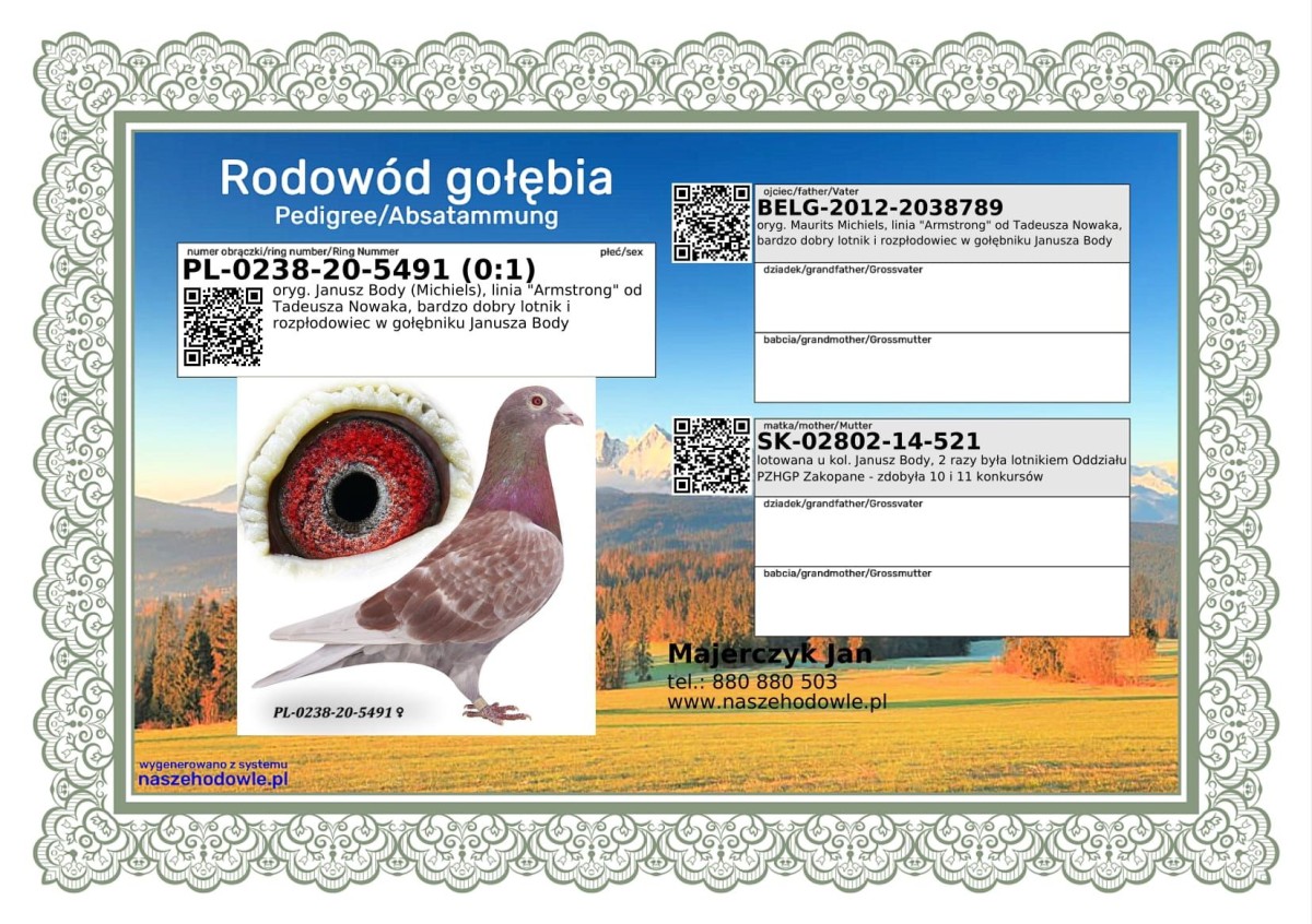 oryg. Janusz Body (Michiels), linia "Armstrong" od Tadeusza Nowaka, bardzo dobry lotnik i rozpłodowiec w gołębniku Janusza Body. Szczegóły pochodzenia w rodowodzie i załączonych materiałach. Więcej informacji o gołębiu pod nr tel.: 880 880 503. Gołąb z gołębnika kol. Jana Majerczyka - Oddział Zakopane.