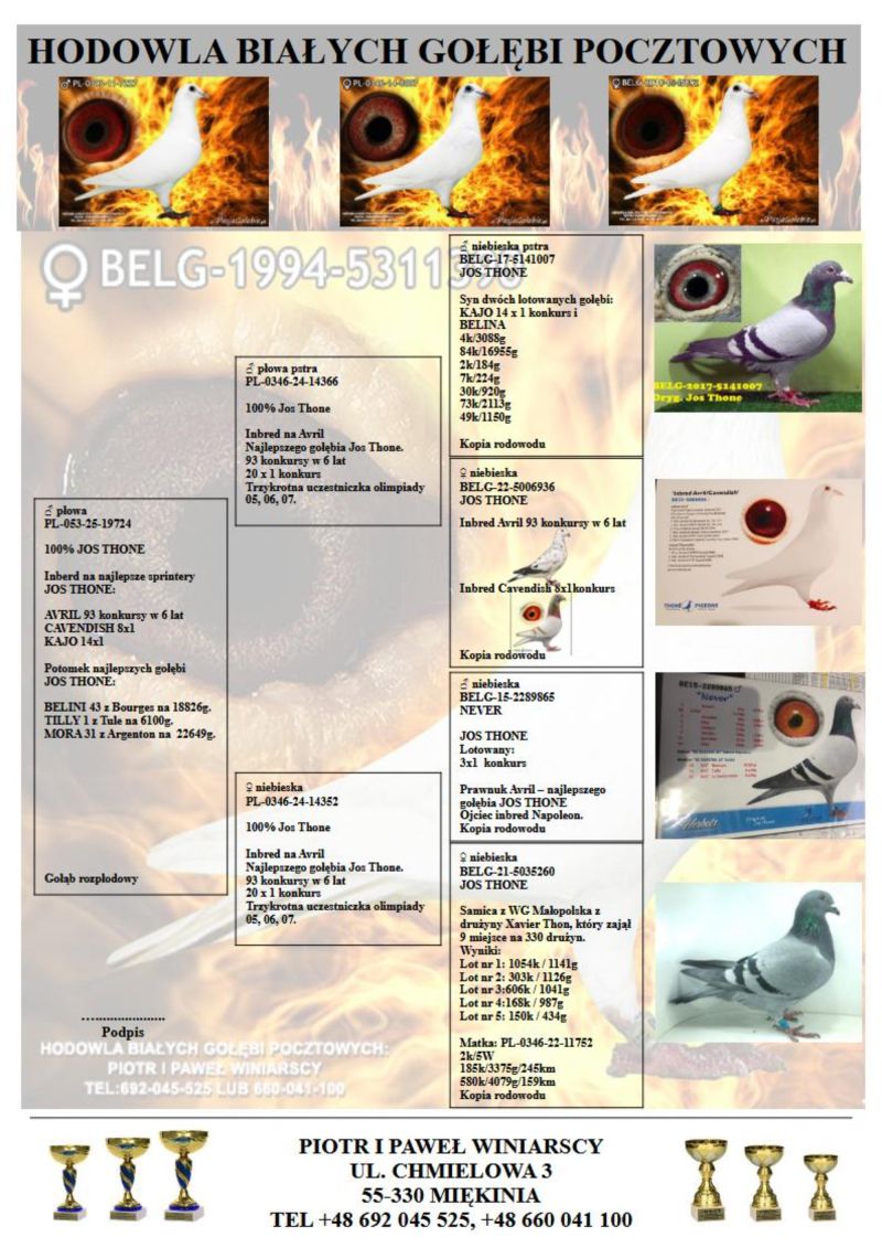 Kup teraz 260. Dzień dobry koleżanki i koledzy.Prezentuje młode gołębie 100% Jos Thoné. Zachęcam do odwiedzenia strony Josa - www.thone.be/en/ .Golebie świetnie nadają się do krzyżowania. W 2024 młody 50% Jos Thoné został 10 lotnikiem na WG. Kolejny młody zdobył 5/6 konkursów w tym zlotu dodatkowego był 7 na rejon. Gołębie są sprzedawane z powodu rezygnacji z lotowania gołębiami w PZHGP. Pełne pochodzenie i karta do kazdego gołębia. Zachęcam do zadawania pytań. Jestem dostępny dla Państwa pod numerem telefonu 692045525. Do usłyszenia i zobaczenia. Do Myszkowa i Grudziądza wysyłka gratis. Proszę o kontakt przed zalicytowaniem w celu ustalenia płci i warunków transportu