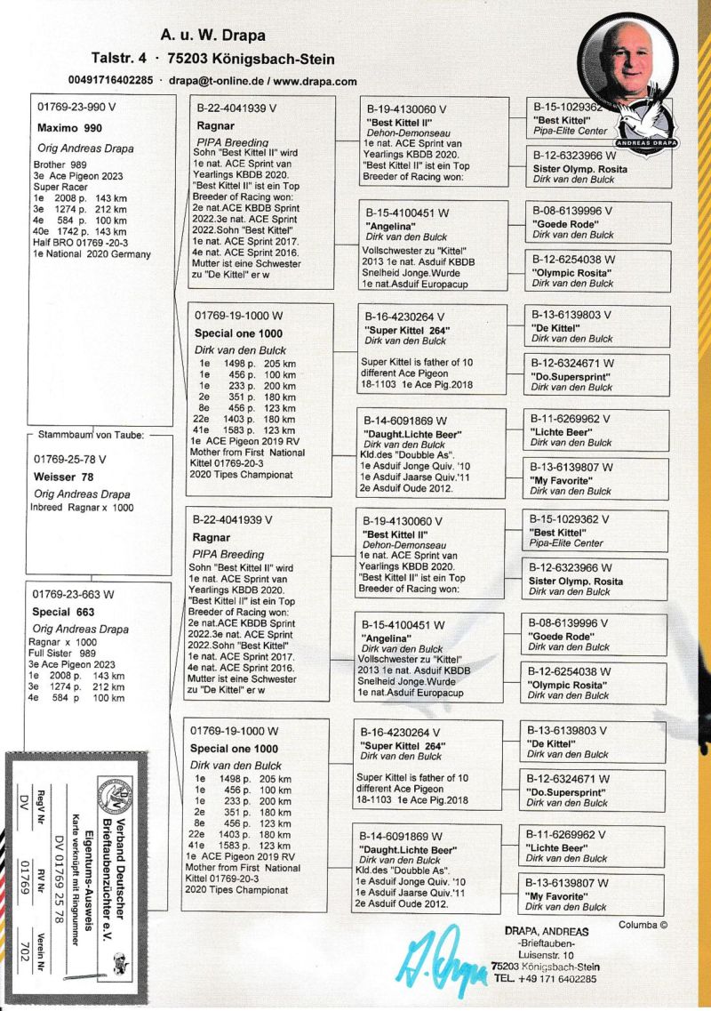 **Uwaga POBICIE NA TEJ AUKCJI WYNOSI 50 ZŁ*** Oryginalny gołąb z hodowli Andreasa Drapy. Szczegóły pochodzenia w rodowodzie. Oferowany gołąb to prawodopodobnie SAMIEC. Gołąb znajduje się już w Polsce u kolegi Roberta Grochowskiego. Gołębia można obejrzeć w Urbanowicach woj. opolskie, po wcześniejszym kontakcie telefonicznym.