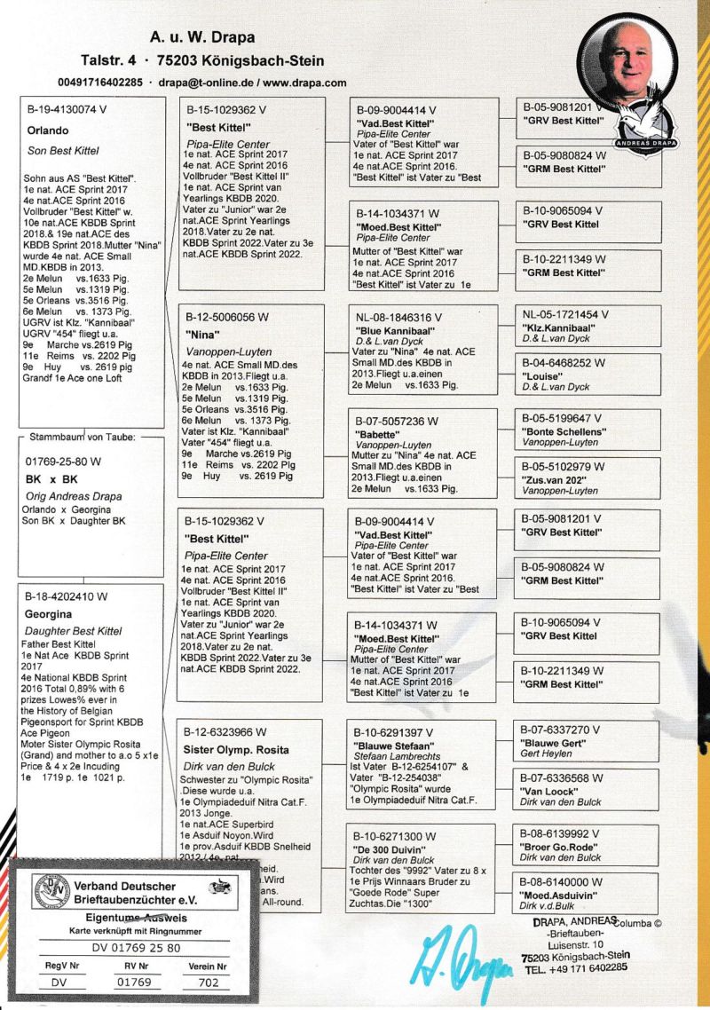 **Uwaga POBICIE NA TEJ AUKCJI WYNOSI 50 ZŁ*** Oryginalny gołąb z hodowli Andreasa Drapy. Szczegóły pochodzenia w rodowodzie. Oferowany gołąb to prawodopodobnie SAMICA. Gołąb znajduje się już w Polsce u kolegi Roberta Grochowskiego. Gołębia można obejrzeć w Urbanowicach woj. opolskie, po wcześniejszym kontakcie telefonicznym.