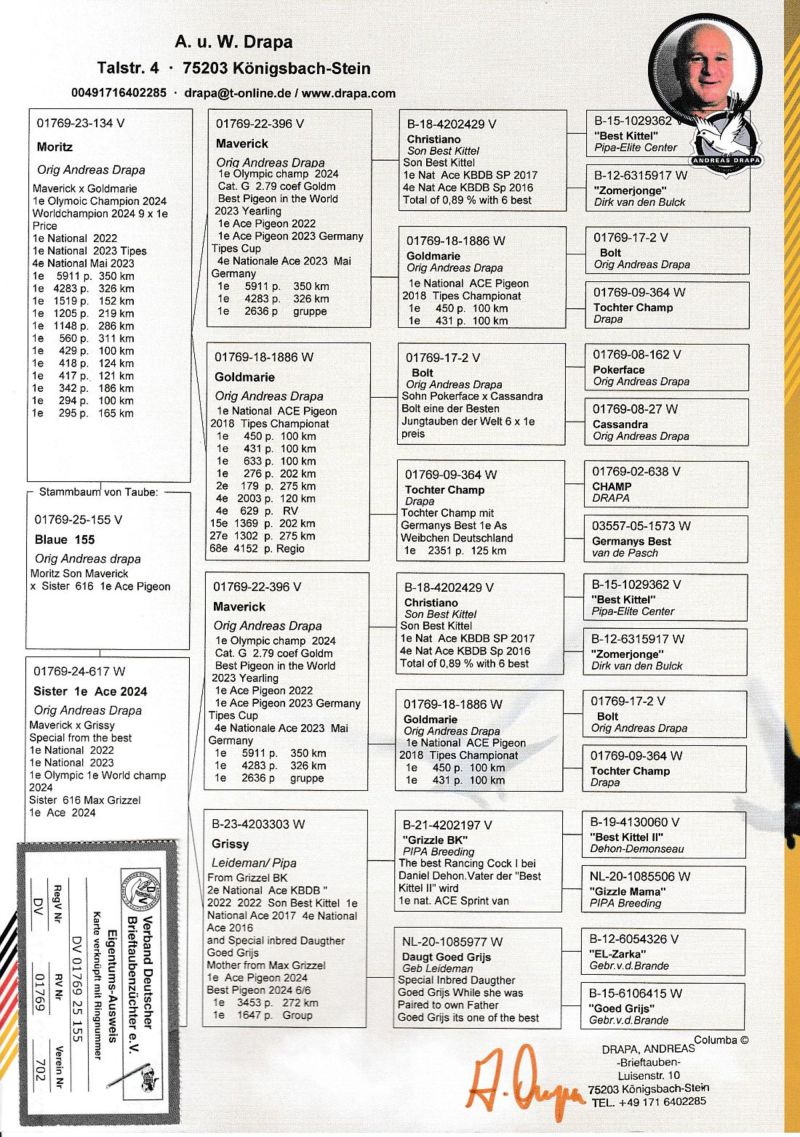 **Uwaga POBICIE NA TEJ AUKCJI WYNOSI 50 ZŁ*** Oryginalny gołąb z hodowli Andreasa Drapy. Szczegóły pochodzenia w rodowodzie. Oferowany gołąb to prawodopodobnie SAMIEC. Gołąb znajduje się już w Polsce u kolegi Roberta Grochowskiego. Gołębia można obejrzeć w Urbanowicach woj. opolskie, po wcześniejszym kontakcie telefonicznym.