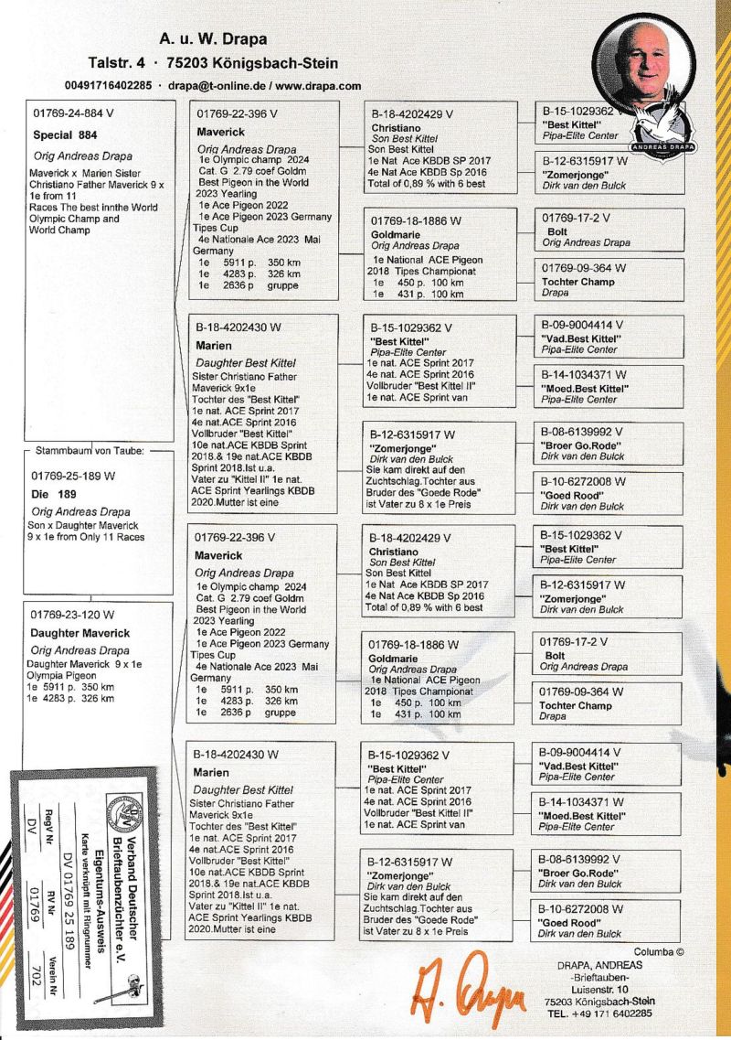 **Uwaga POBICIE NA TEJ AUKCJI WYNOSI 50 ZŁ*** Oryginalny gołąb z hodowli Andreasa Drapy. Szczegóły pochodzenia w rodowodzie. Oferowany gołąb to prawodopodobnie SAMICA. Gołąb znajduje się już w Polsce u kolegi Roberta Grochowskiego. Gołębia można obejrzeć w Urbanowicach woj. opolskie, po wcześniejszym kontakcie telefonicznym.