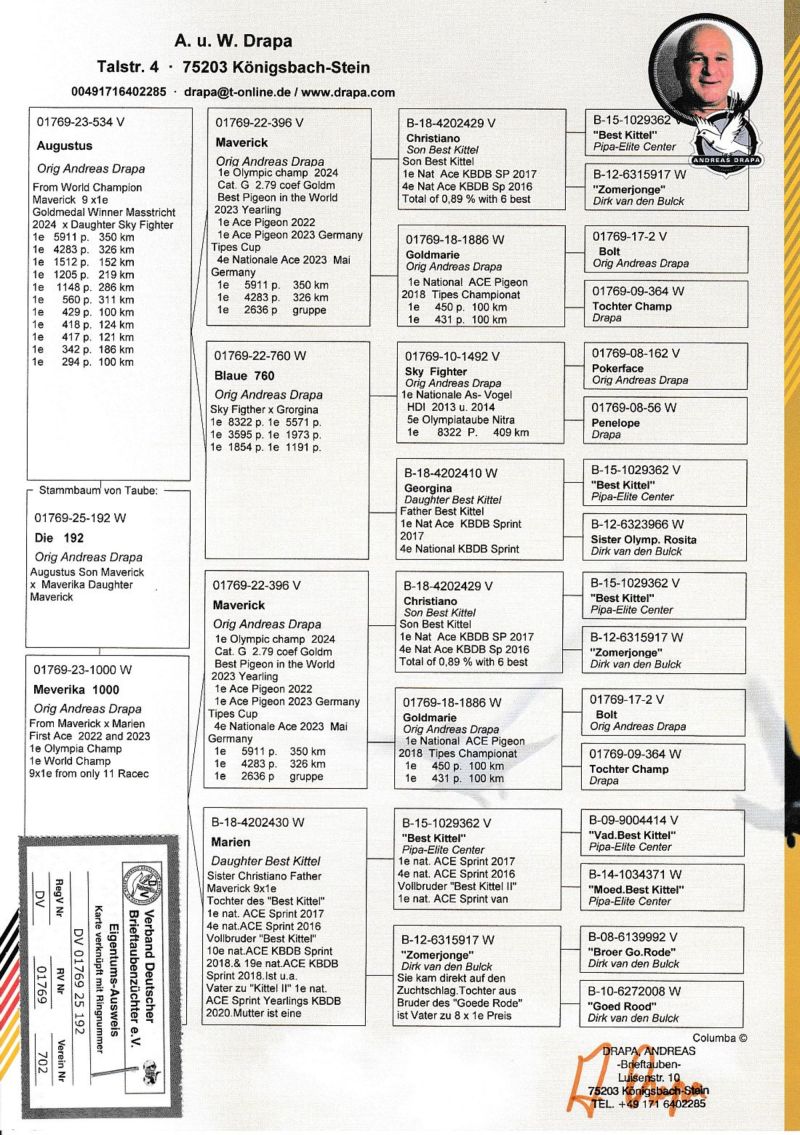 **Uwaga POBICIE NA TEJ AUKCJI WYNOSI 50 ZŁ*** Oryginalny gołąb z hodowli Andreasa Drapy. Szczegóły pochodzenia w rodowodzie. Oferowany gołąb to prawodopodobnie SAMICA. Gołąb znajduje się już w Polsce u kolegi Roberta Grochowskiego. Gołębia można obejrzeć w Urbanowicach woj. opolskie, po wcześniejszym kontakcie telefonicznym.