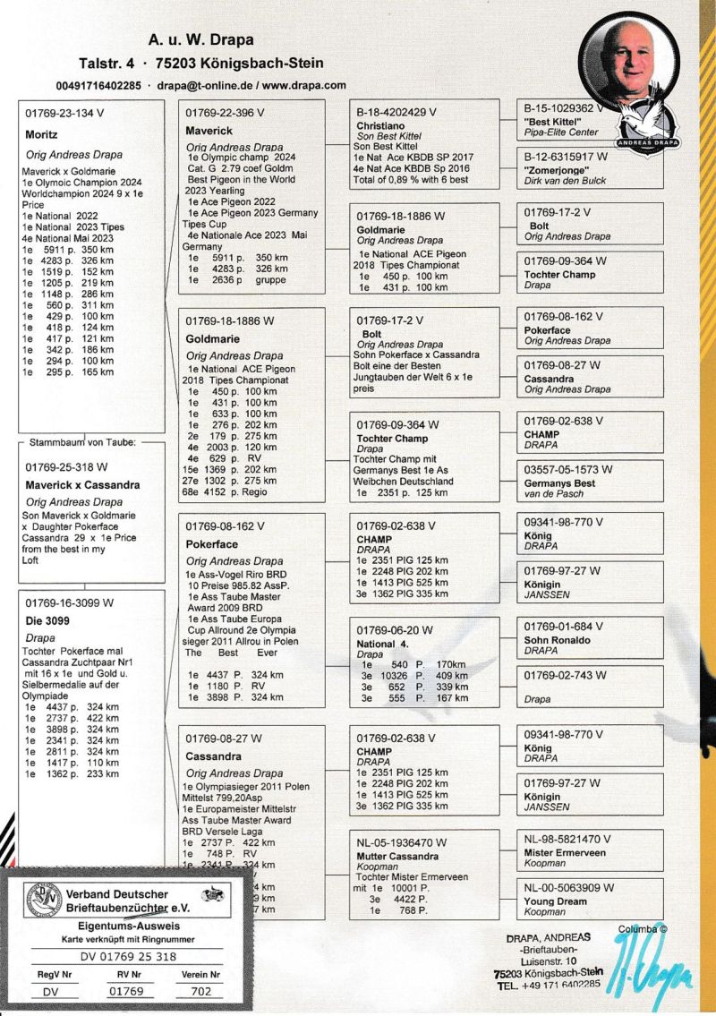 **Uwaga POBICIE NA TEJ AUKCJI WYNOSI 50 ZŁ*** Oryginalny gołąb z hodowli Andreasa Drapy. Szczegóły pochodzenia w rodowodzie. Oferowany gołąb to prawodopodobnie SAMICA. Gołąb znajduje się już w Polsce u kolegi Roberta Grochowskiego. Gołębia można obejrzeć w Urbanowicach woj. opolskie, po wcześniejszym kontakcie telefonicznym.
