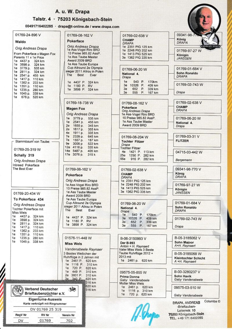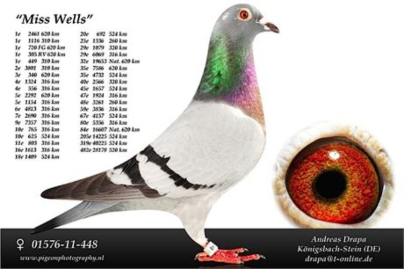 **Uwaga POBICIE NA TEJ AUKCJI WYNOSI 50 ZŁ*** Oryginalny gołąb z hodowli Andreasa Drapy. Szczegóły pochodzenia w rodowodzie. Oferowany gołąb to prawodopodobnie SAMICA. Gołąb znajduje się już w Polsce u kolegi Roberta Grochowskiego. Gołębia można obejrzeć w Urbanowicach woj. opolskie, po wcześniejszym kontakcie telefonicznym.