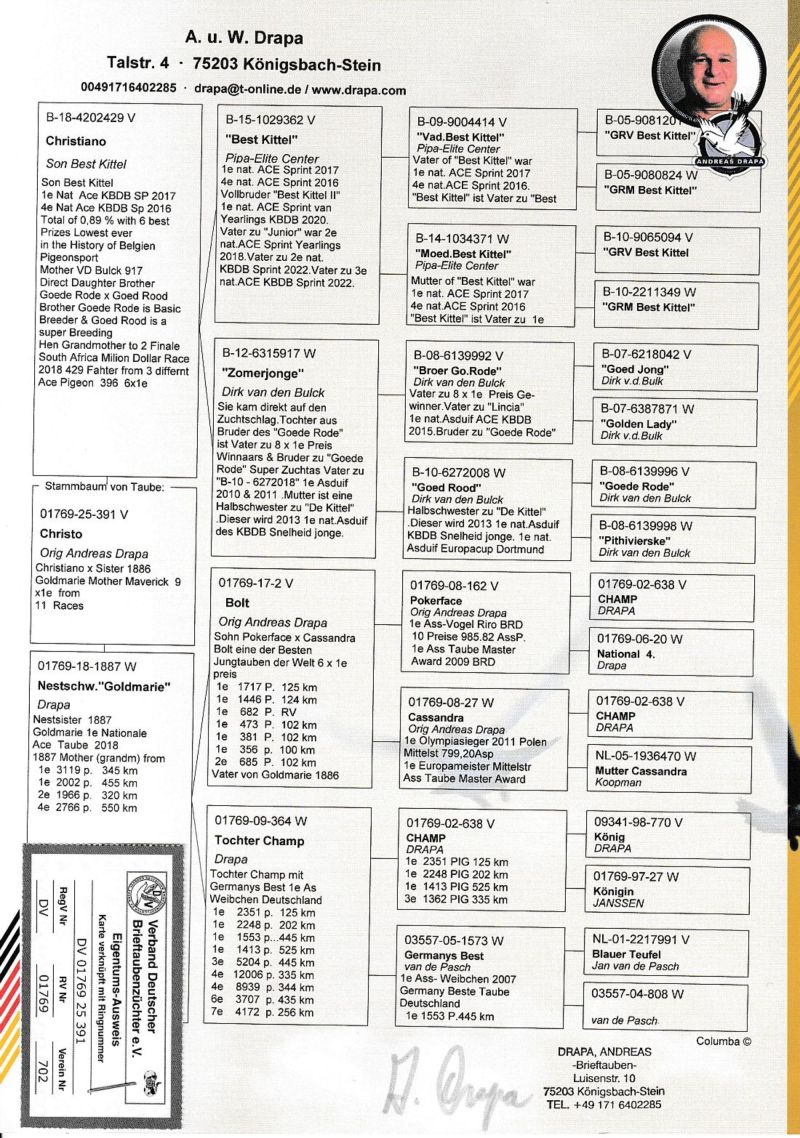 **Uwaga POBICIE NA TEJ AUKCJI WYNOSI 50 ZŁ*** Oryginalny gołąb z hodowli Andreasa Drapy. Szczegóły pochodzenia w rodowodzie. Oferowany gołąb to prawodopodobnie SAMIEC. Gołąb znajduje się już w Polsce u kolegi Roberta Grochowskiego. Gołębia można obejrzeć w Urbanowicach woj. opolskie, po wcześniejszym kontakcie telefonicznym.
