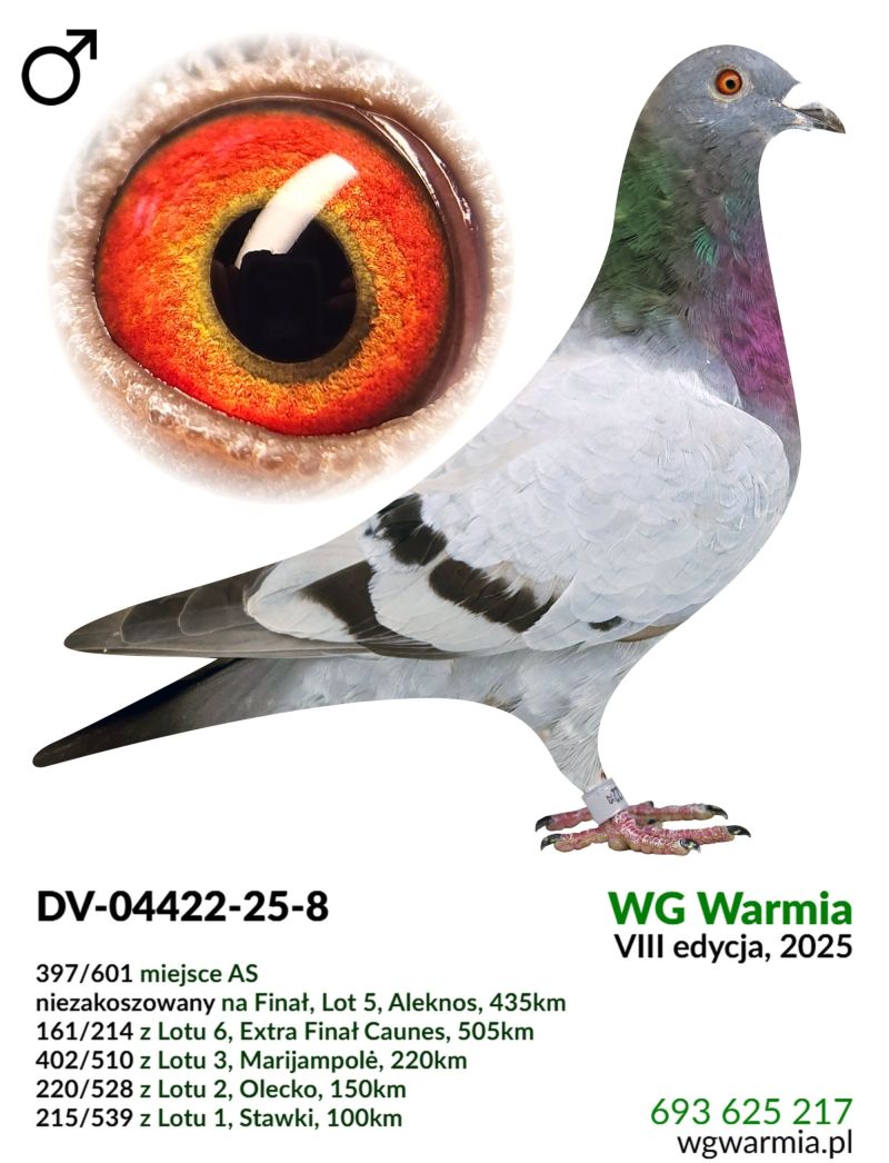 Uczestnik WG Warmia 2025, sezon VIII. Loty z kierunku północny wschód, Litwa. Wrócił po Finale, 397 AS, 161 z Extra Finału. Szczegóły pochodzenia w rodowodzie.