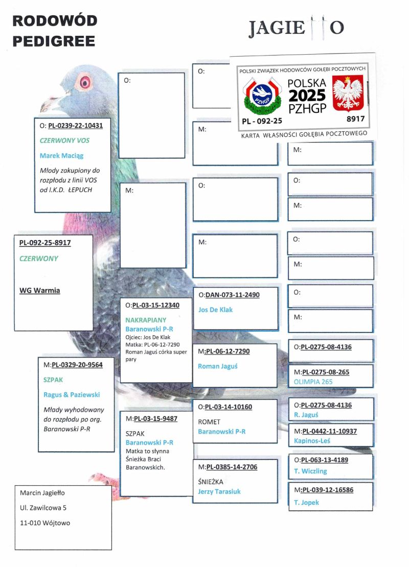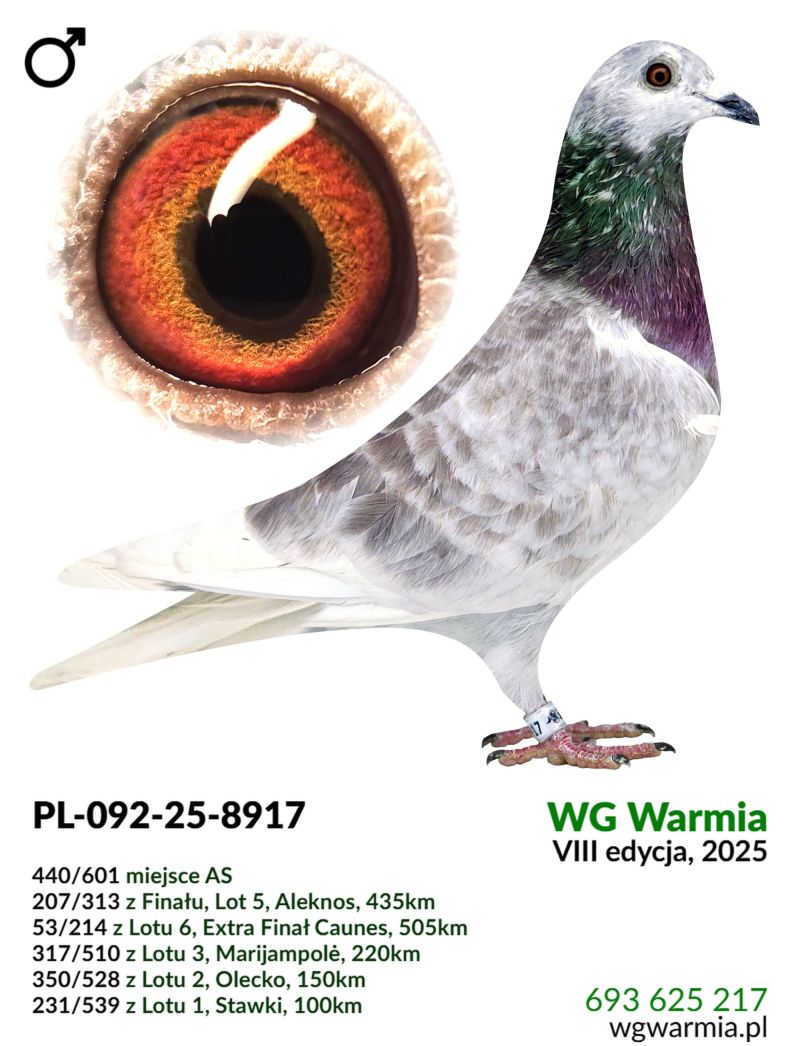 Uczestnik WG Warmia 2025, sezon VIII. Loty z kierunku północny wschód, Litwa. 207 z Finału, 440 AS, 53 z Extra Finału. Szczegóły pochodzenia w rodowodzie.