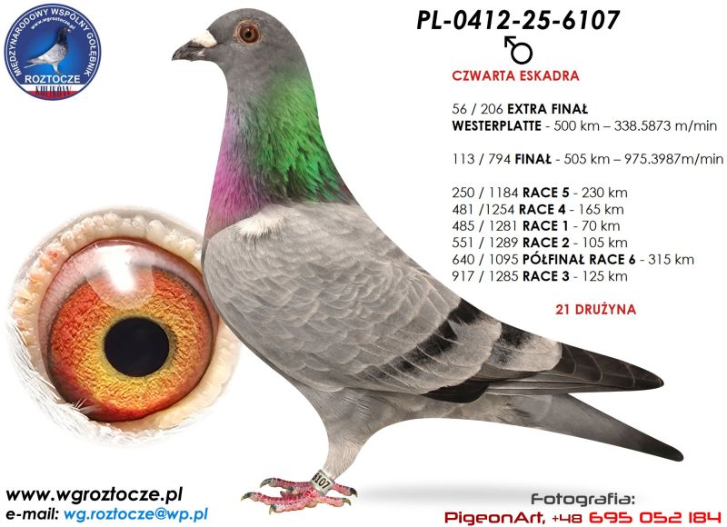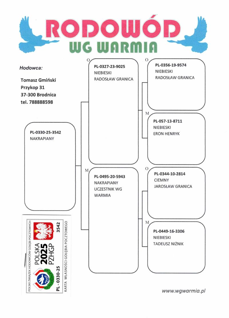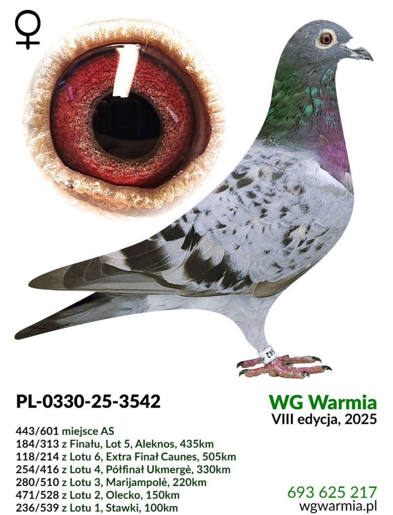 Uczestnik WG Warmia 2025, sezon VIII. Loty z kierunku północny wschód, Litwa. 184 z Finału, 443 AS, 118 z Extra Finału. Szczegóły pochodzenia w rodowodzie.