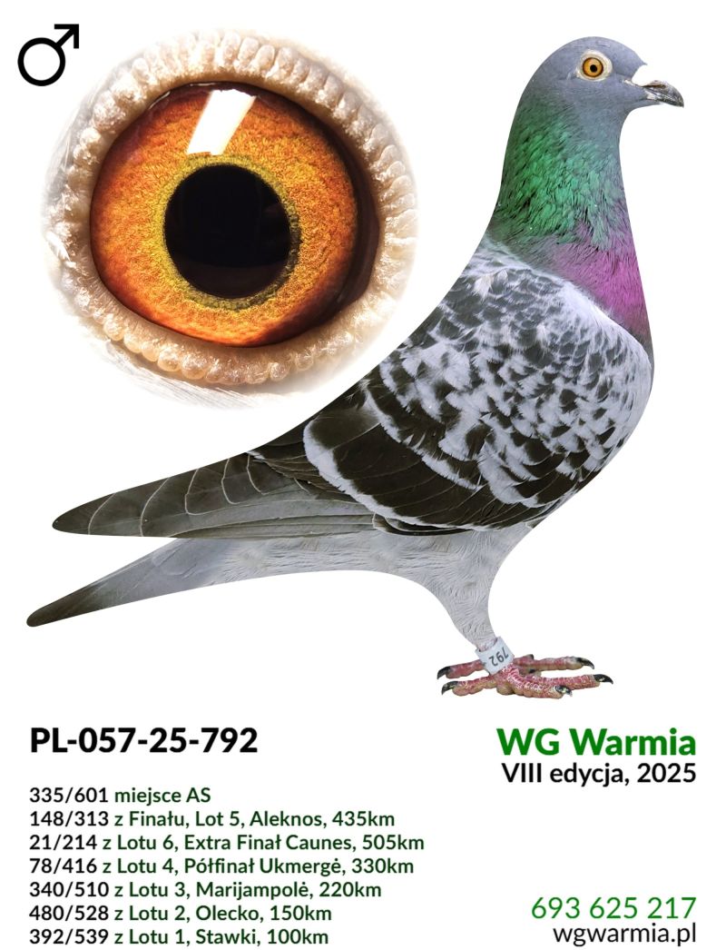 Uczestnik WG Warmia 2025, sezon VIII. Loty z kierunku północny wschód, Litwa. 148 z Finału, 335 AS, 21 z Extra Finału. Szczegóły pochodzenia w rodowodzie.