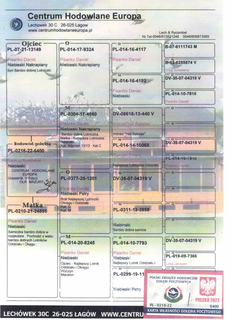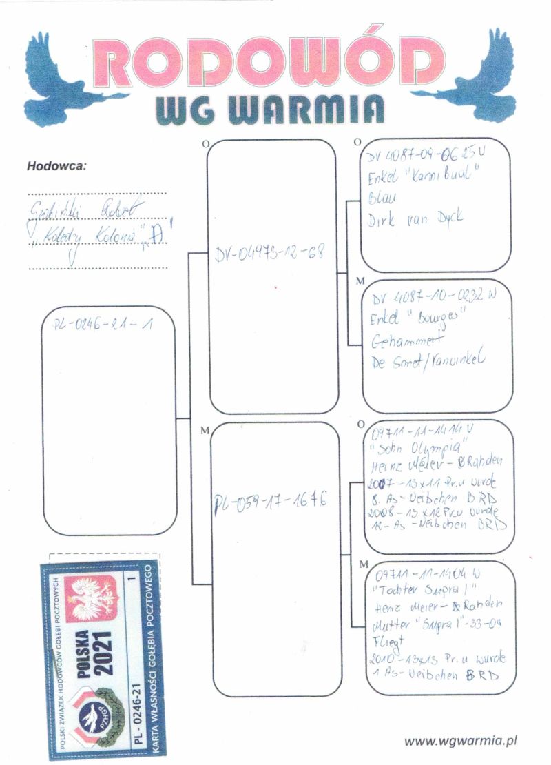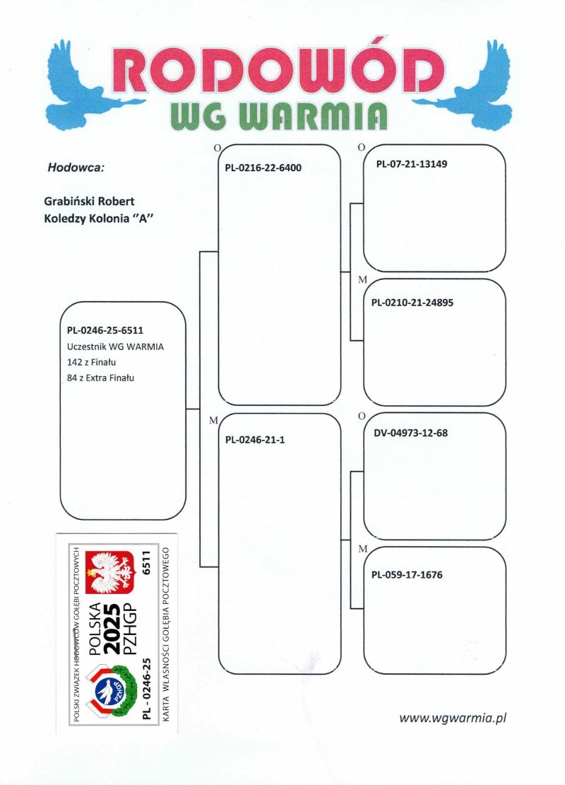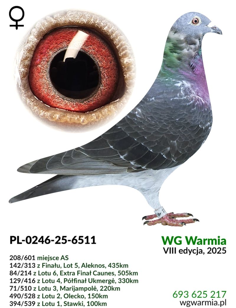 Uczestnik WG Warmia 2025, sezon VIII. Loty z kierunku północny wschód, Litwa. 142 z Finału, 208 AS, 84 z Extra Finału. Szczegóły pochodzenia w rodowodzie.