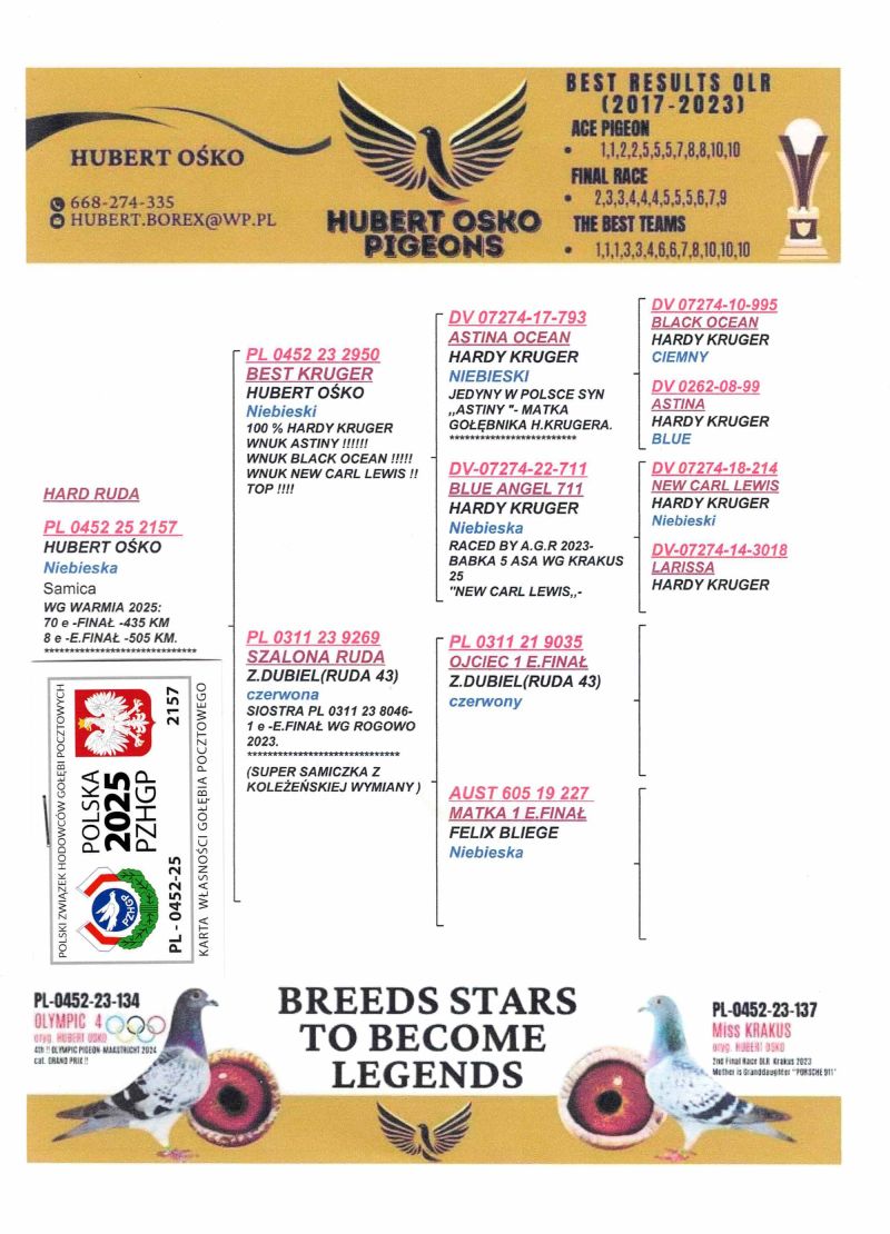 Uczestnik WG Warmia 2025, sezon VIII. Loty z kierunku północny wschód, Litwa. 70 z Finału, 157 AS, 8 z Extra Finału. Szczegóły pochodzenia w rodowodzie.