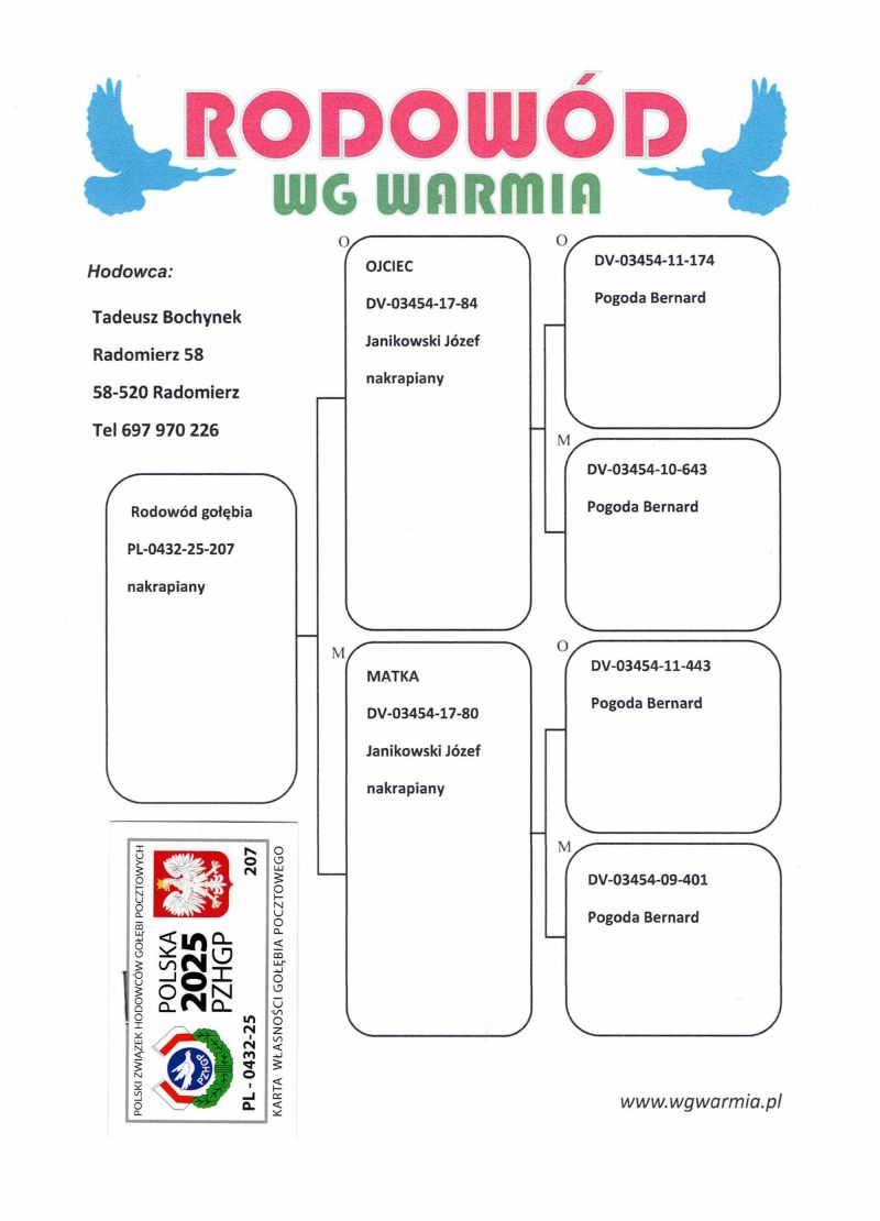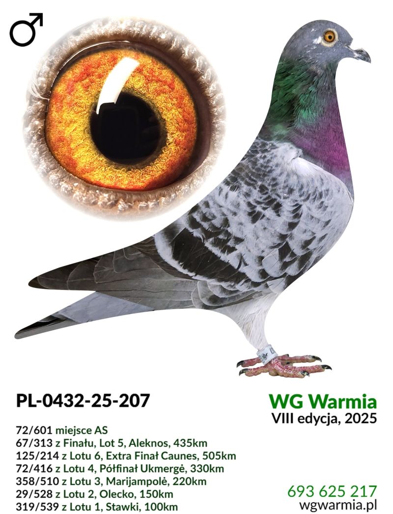 Uczestnik WG Warmia 2025, sezon VIII. Loty z kierunku północny wschód, Litwa. 67 z Finału, 72 AS, 125 z Extra Finału. Szczegóły pochodzenia w rodowodzie.