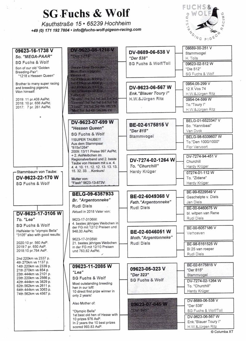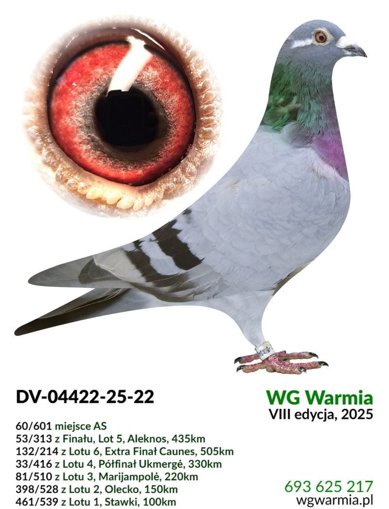 Uczestnik WG Warmia 2025, sezon VIII. Loty z kierunku północny wschód, Litwa. 53 z Finału, 60 AS, 132 z Extra Finału. Szczegóły pochodzenia w rodowodzie.