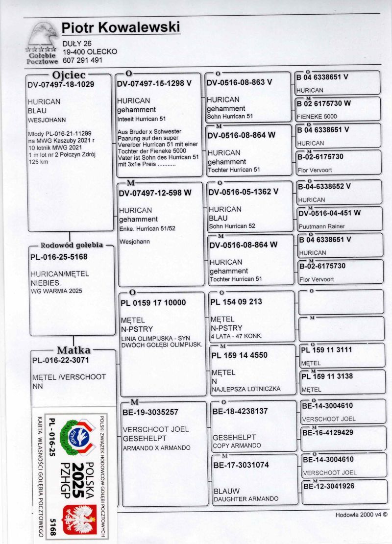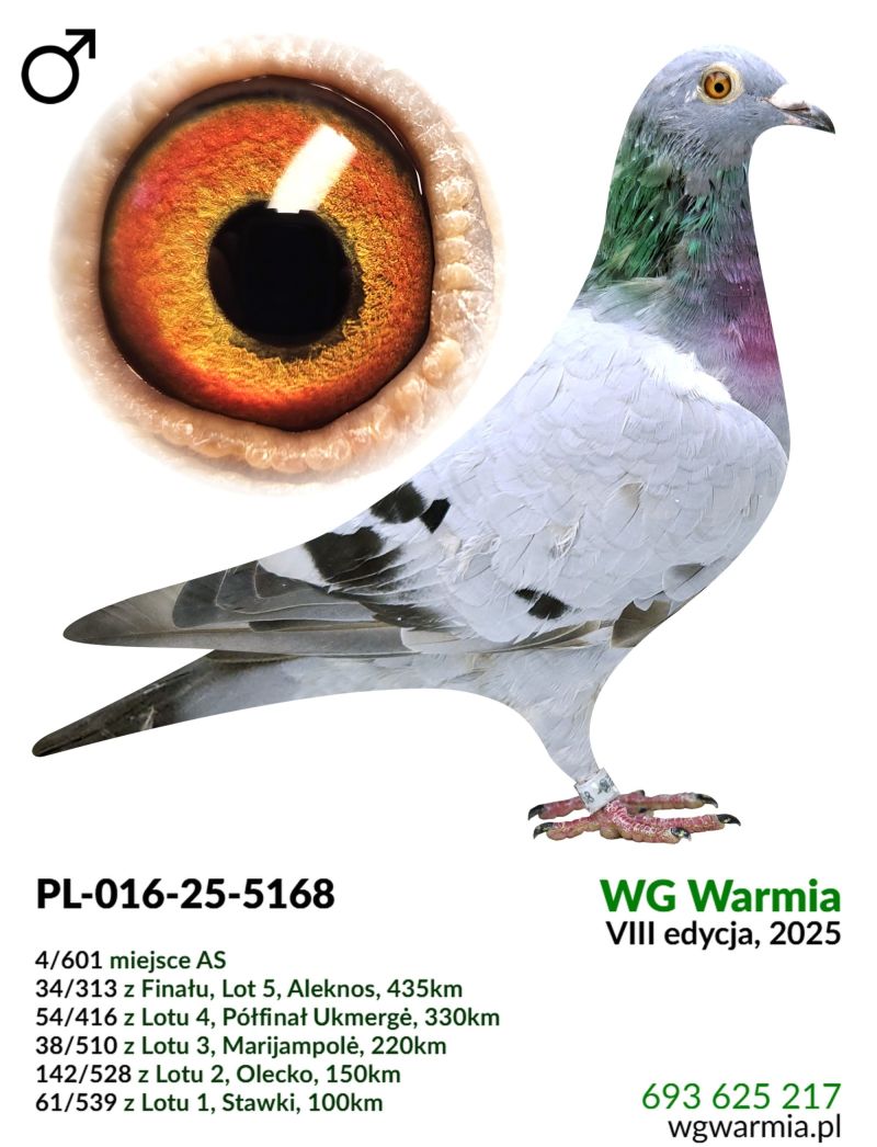 Uczestnik WG Warmia 2025, sezon VIII. Loty z kierunku północny wschód, Litwa. 34 z Finału, 4 AS. Szczegóły pochodzenia w rodowodzie.