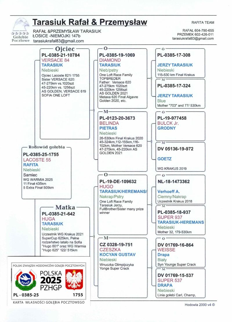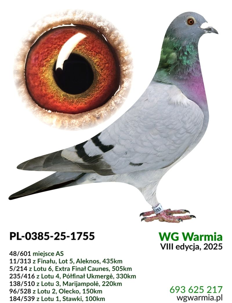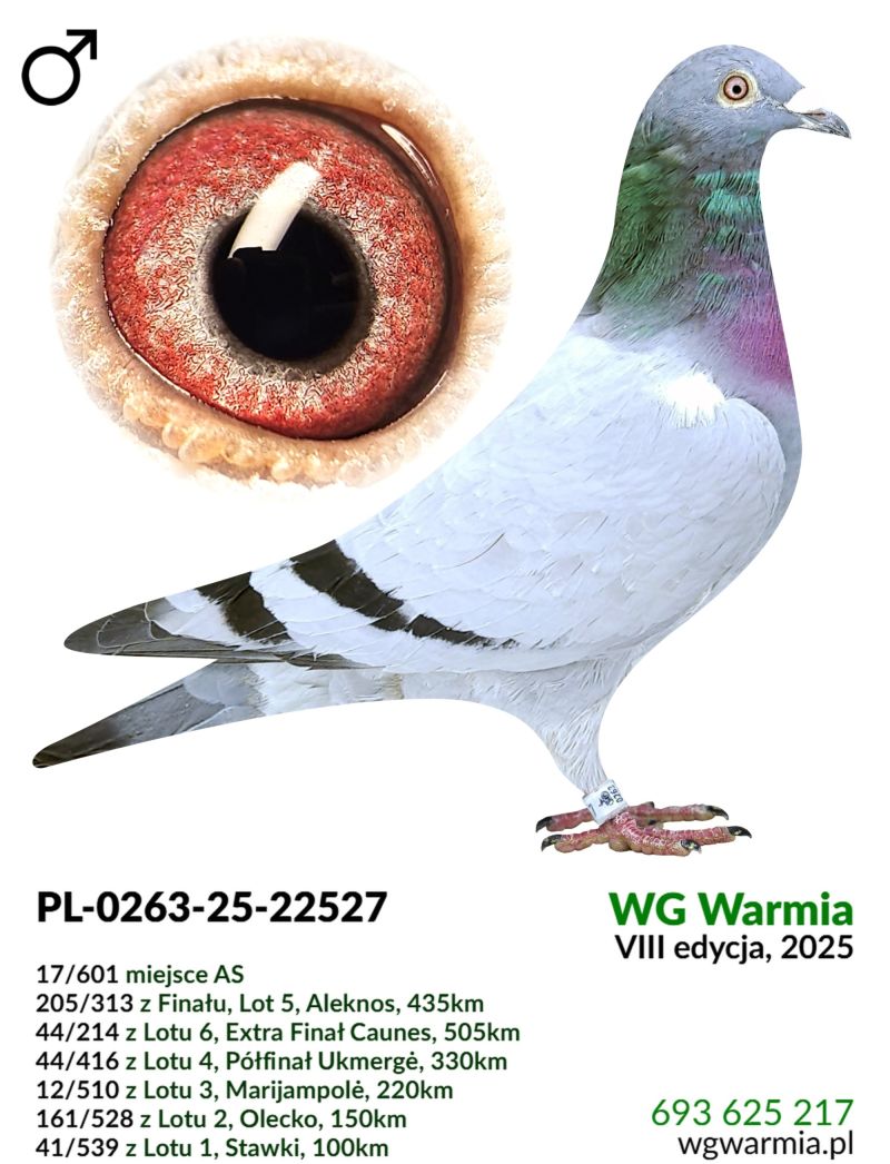 Uczestnik WG Warmia 2025, sezon VIII. Loty z kierunku północny wschód, Litwa. 11 z Finału, 48 AS, 5 z Extra Finału. Szczegóły pochodzenia w rodowodzie.