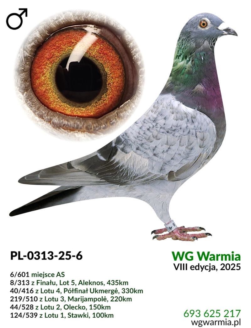 Uczestnik WG Warmia 2025, sezon VIII. Loty z kierunku północny wschód, Litwa. 8 z Finału, 6 AS. Szczegóły pochodzenia w rodowodzie.