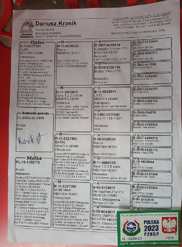 PL-0350-23-7379 Oryg. Dariusz Krasik 100% Henri Menten Samiec z rodziny Olimpijskich Gołębi