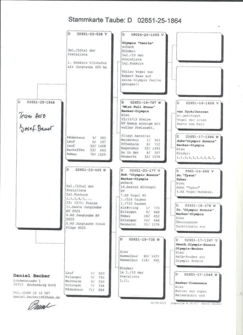 Gołębie ze wspólnego gołębnika UPLAND DERBY Willingen,szczegóły pochodzenia w rodowodzie.Gołębie brały udział w 11 lotach treningowych , 4 konkursowych i 5 lot Finałowy 344km,Więcej informacji pod nr tel.: 603 312 976, Wyniki dostępne klikając w link ,transport gołębi po wcześniejszej wpłacie pieniążków na konto .Gołębie będą rozwożone po 07.11.2025 ,koszt transportu 1-3szt-120zł,3-6szt-140zł płatne kurierowi.