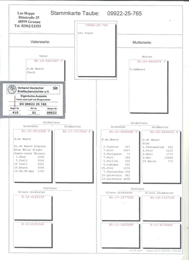 Gołębie ze wspólnego gołębnika UPLAND DERBY Willingen,szczegóły pochodzenia w rodowodzie.Gołębie brały udział w 11 lotach treningowych , 4 konkursowych i 5 lot Finałowy 344km,Więcej informacji pod nr tel.: 603 312 976, Wyniki dostępne klikając w link ,transport gołębi po wcześniejszej wpłacie pieniążków na konto .Gołębie będą rozwożone po 07.11.2025 ,koszt transportu 1-3szt-120zł,3-6szt-140zł płatne kurierowi.