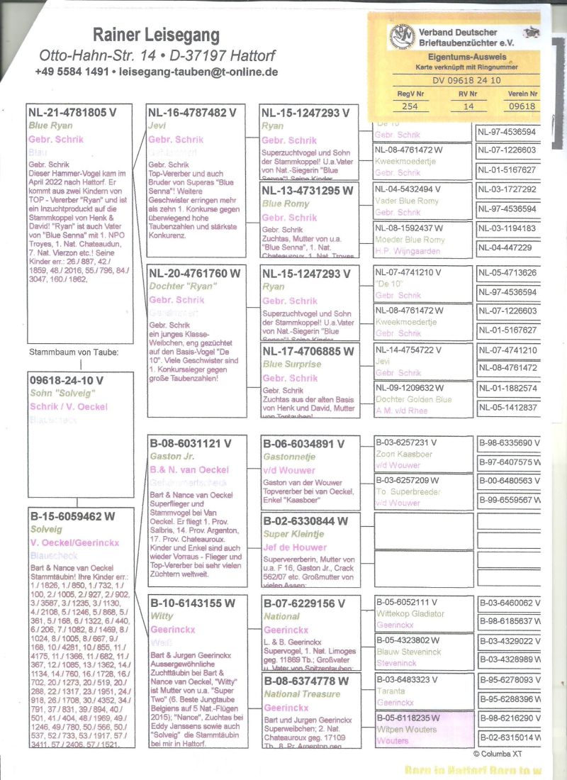Gołębie ze wspólnego gołębnika UPLAND DERBY Willingen,szczegóły pochodzenia w rodowodzie.Gołębie brały udział w 11 lotach treningowych , 4 konkursowych i 5 lot Finałowy 344km,Więcej informacji pod nr tel.: 603 312 976, Wyniki dostępne klikając w link ,transport gołębi po wcześniejszej wpłacie pieniążków na konto .Gołębie będą rozwożone po 07.11.2025 ,koszt transportu 1-3szt-120zł,3-6szt-140zł płatne kurierowi.
