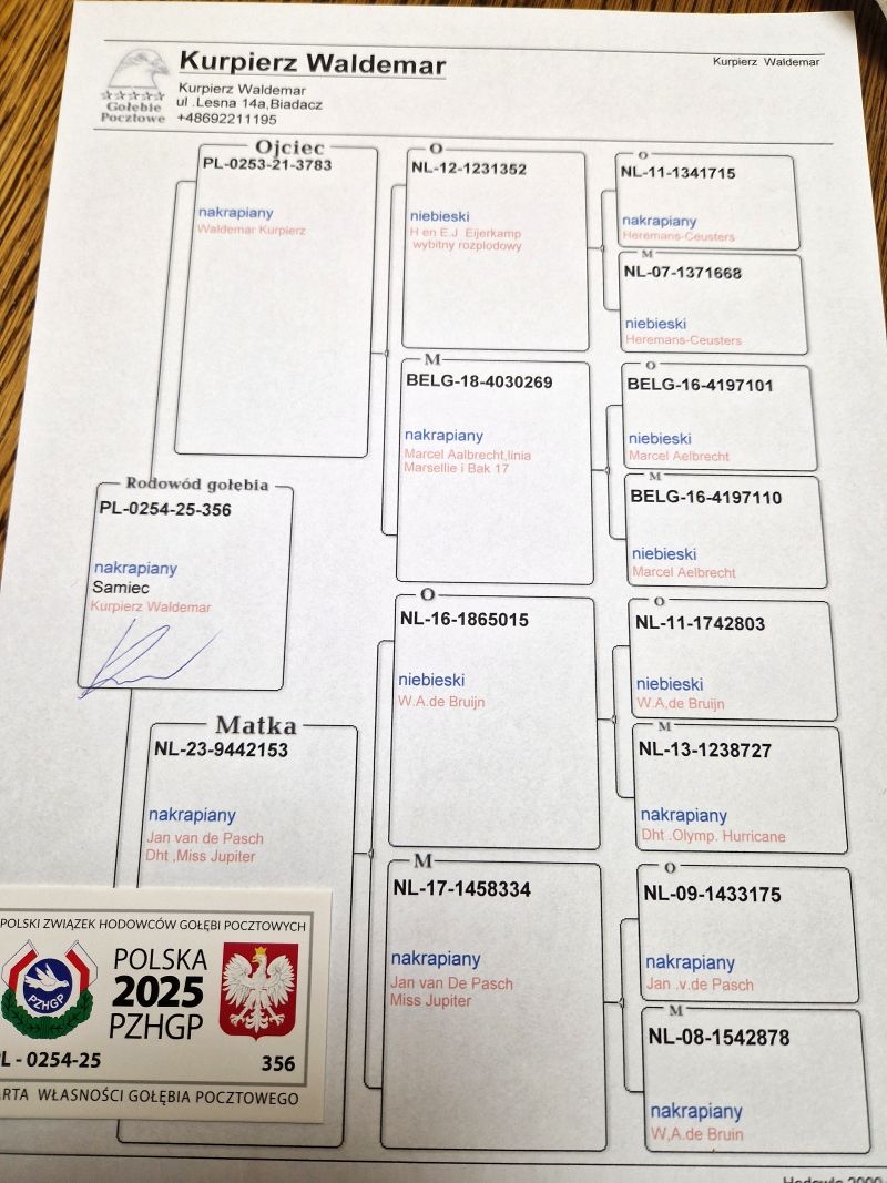 Oryginalny gołąb z hodowli Waldemar Kurpierz. Gołąb wywodzi się z Córki Miss Jupiter-Jan van de Pascha Szczegóły pochodzenia w rodowodzie. Więcej informacji pod nr tel.: 692211195