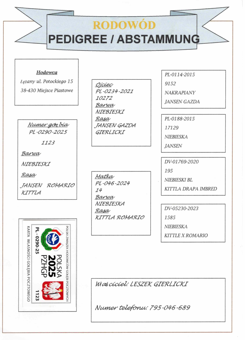 Płeć: samiec Hodowca - rasa: Oryg.GIERLICKI LESZEK Zakończenie: 26.10.2025 godz. 19:48