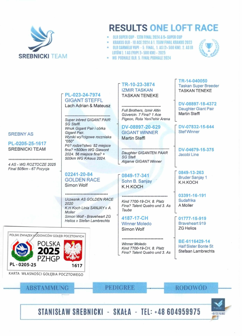 więcej info.w rodowodzie i na stronie Benzing Live.oneloftrace.live/lofts/260?season=2458&tab=flights