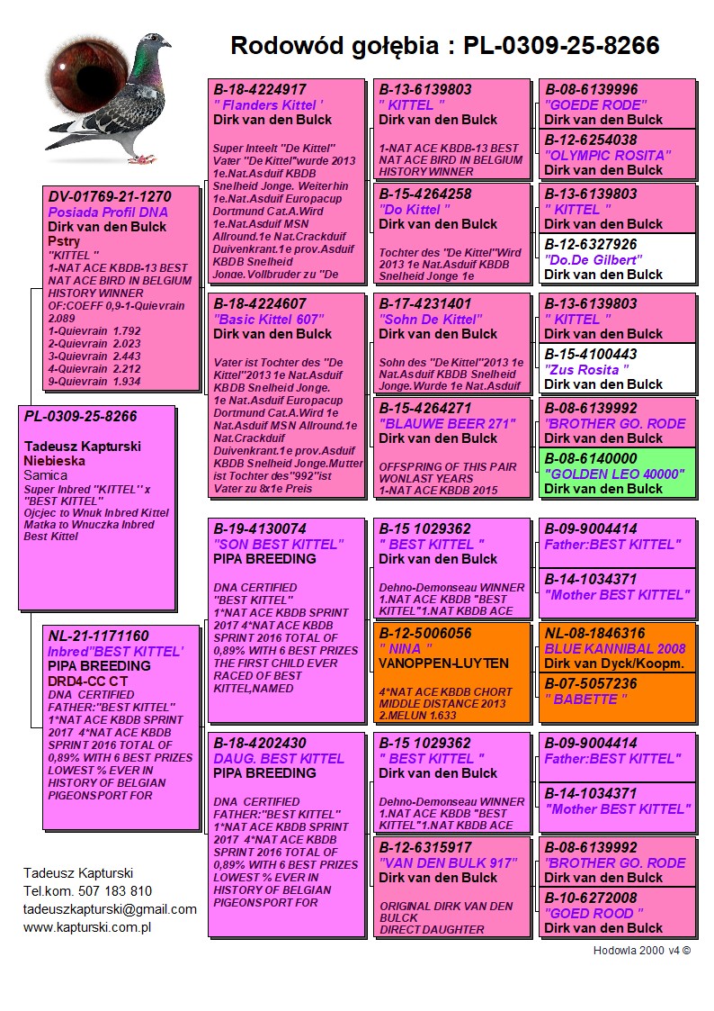 Oryginalny gołąb z hodowli Tadeusza Kapturskiego. Szczegóły pochodzenia w rodowodzie. Więcej informacji pod nr tel. 507183810 **transport kurier 165 zł. **NA ŻYCZENIE CERTYFIKAT DNA
