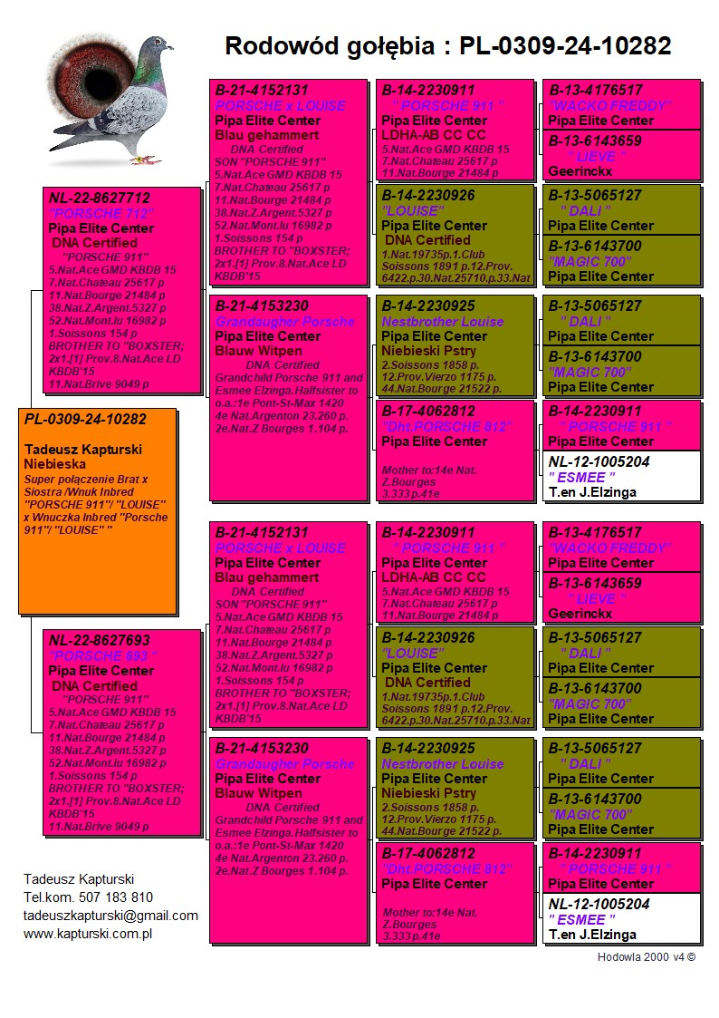 Oryginalny gołąb z hodowli Tadeusza Kapturskiego. Szczegóły pochodzenia w rodowodzie. Więcej informacji pod nr tel. 507183810 **transport kurier 165 zł. **NA ŻYCZENIE CERTYFIKAT DNA