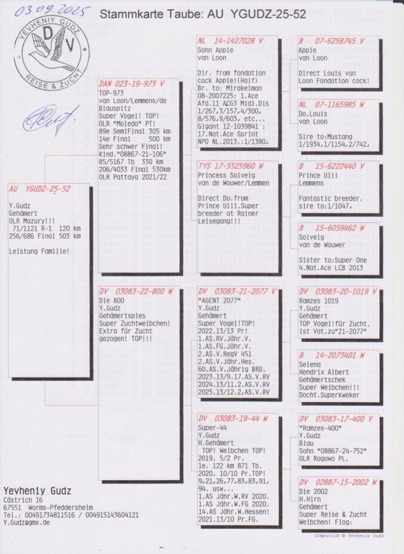 Szczegóły pochodzenia w rodowodzie. Pełne wyniki gołębia w sezonie lotowym na stronie: