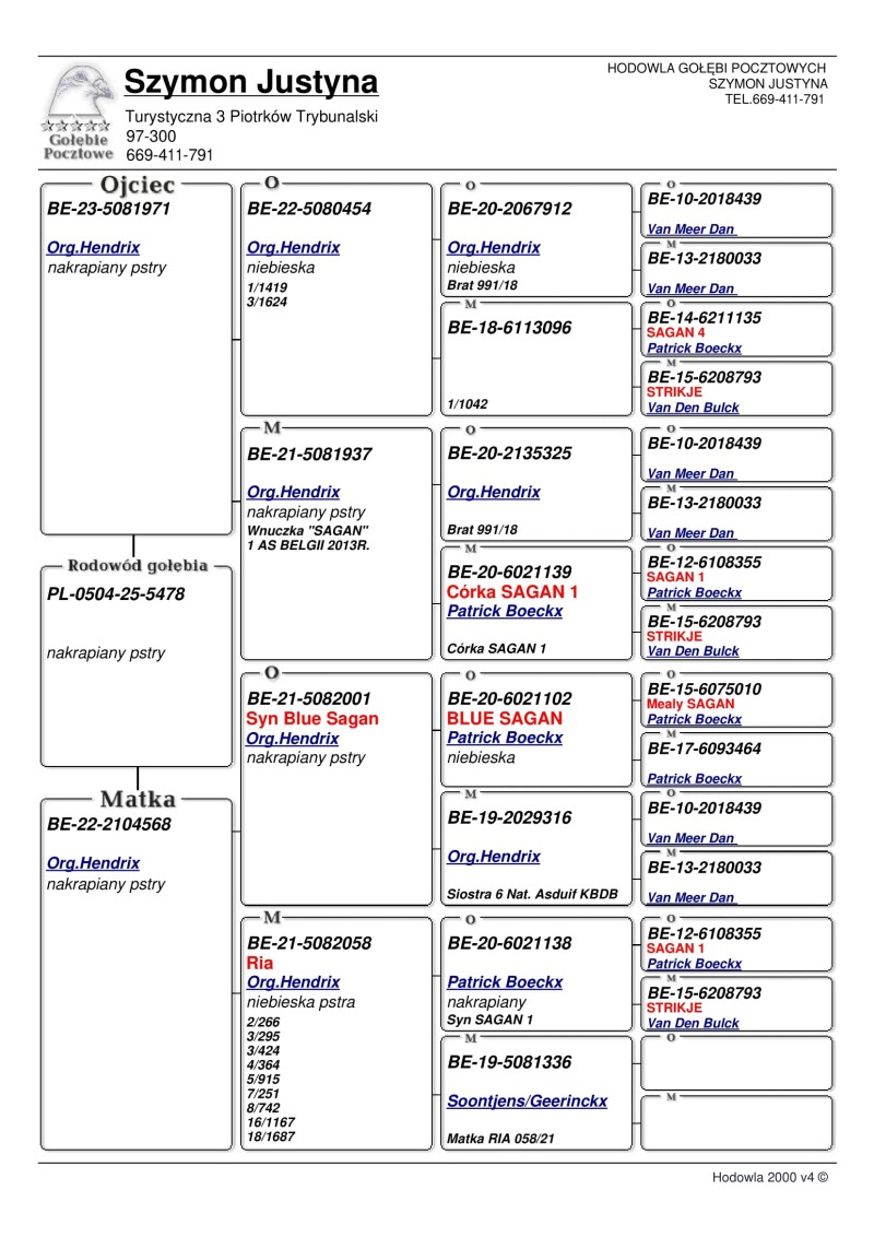 Oryginalny gołąb z hodowli Szymon Justyna. Późny gołąb po oryginałach Albert Hendrix Prawdopodobnie samiczka. Szczegóły pochodzenia w rodowodzie. Więcej informacji pod nr tel.: 669-411-791