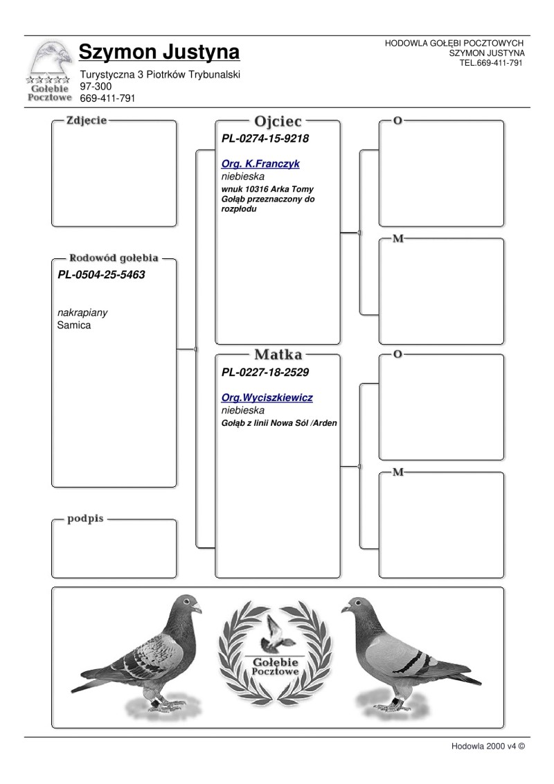 Oryginalny gołąb z hodowli Szymon Justyna. Późny gołąb po gołębiach rozpłodowych. Prawdopodobnie samiczka. Szczegóły pochodzenia w rodowodzie. Więcej informacji pod nr tel.: 669-411-791