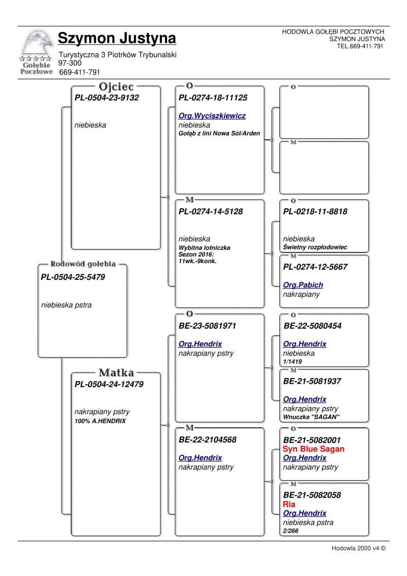 Oryginalny gołąb z hodowli Szymon Justyna. Późny gołąb po gołębiach lotowych, matka to 100% Albert Hendrix. Prawdopodobnie samczyk. Szczegóły pochodzenia w rodowodzie. Więcej informacji pod nr tel.: 669-411-791