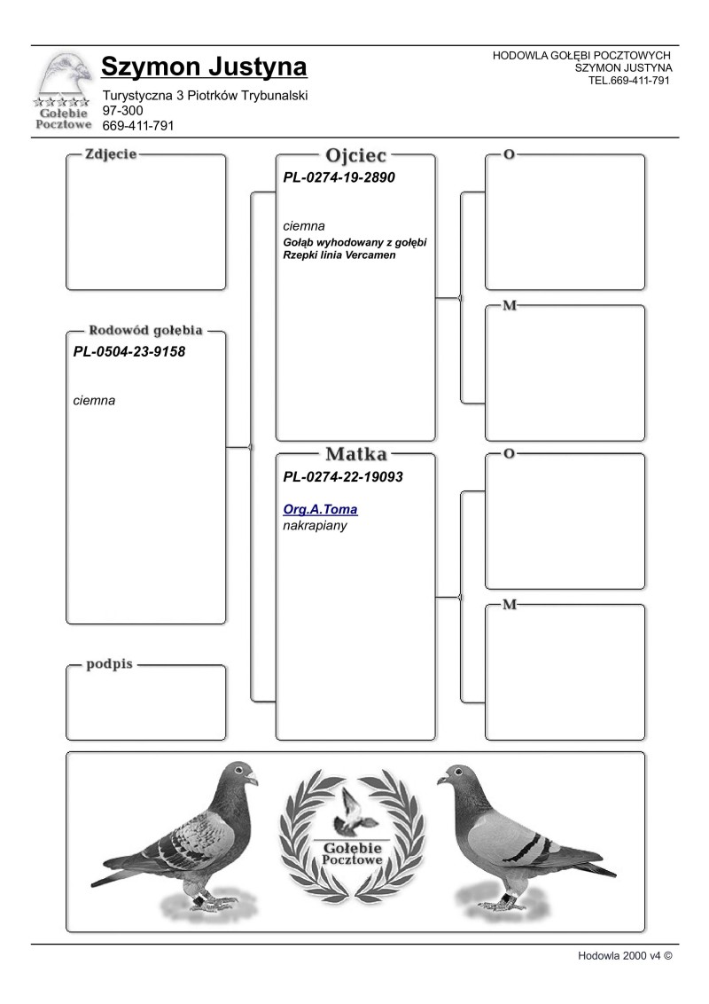 Oryginalny gołąb z hodowli Szymon Justyna. Prawdopodobnie samiczka wychowana po bardzo dobrej parze rozpłodowej. Szczegóły pochodzenia w rodowodzie. Więcej informacji pod nr tel.: 669-411-791