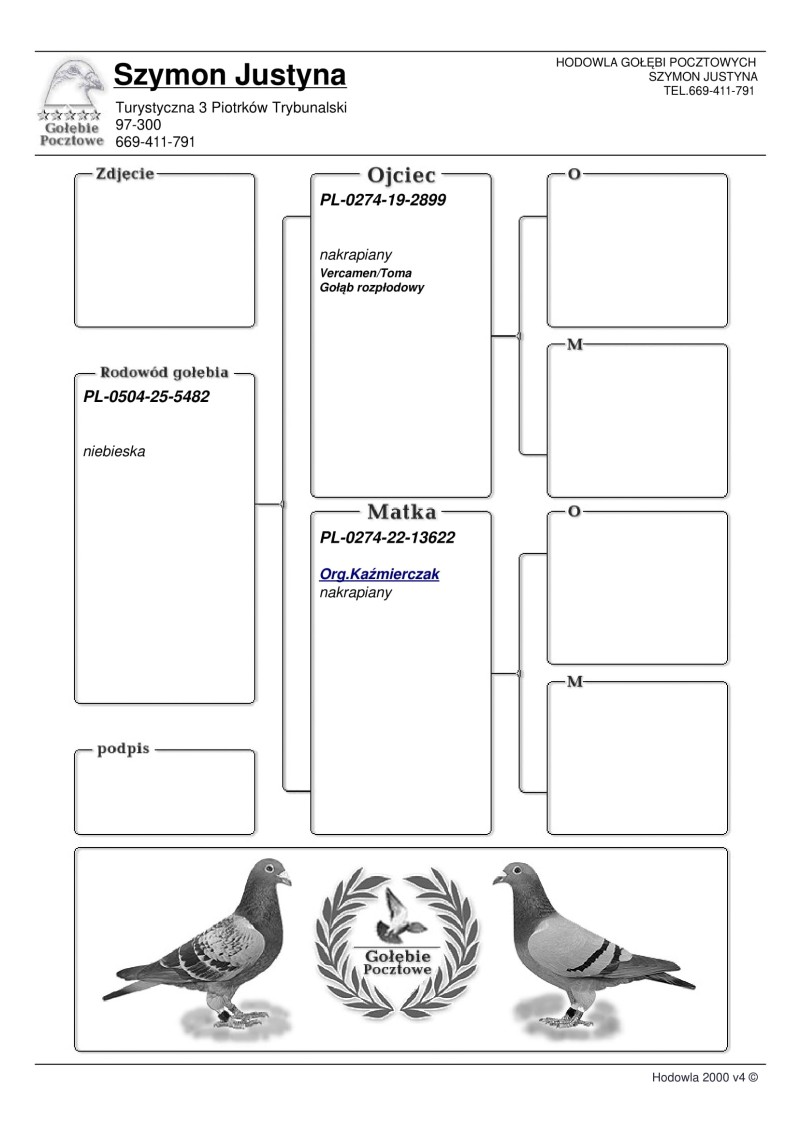 Oryginalny gołąb z hodowli Szymon Justyna. Późny młody prawdopodobnie samczyk wychodowany z gołębi rozpłodowych. Szczegóły pochodzenia w rodowodzie. Więcej informacji pod nr tel.: 669-411-791
