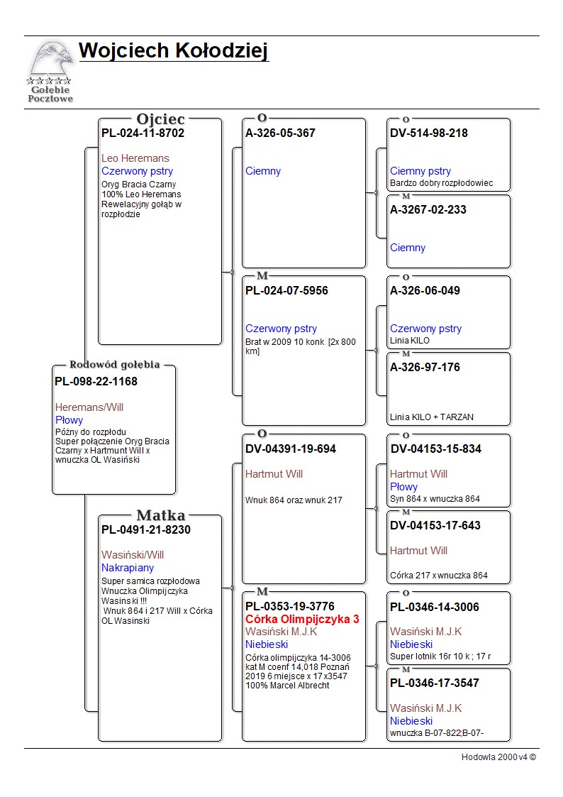 Oryginalny gołąb z hodowli Wojciecha Kołodzieja. Szczegóły pochodzenia w rodowodzie. Więcej informacji pod nr tel.: 608077136 **Wysyłka do 6 sztuk w jednej paczce za 150zł, przedpłata na konto. **przed zalicytowaniem proszę o kontakt z właścicielem w sprawie płci oferowanego gołębia