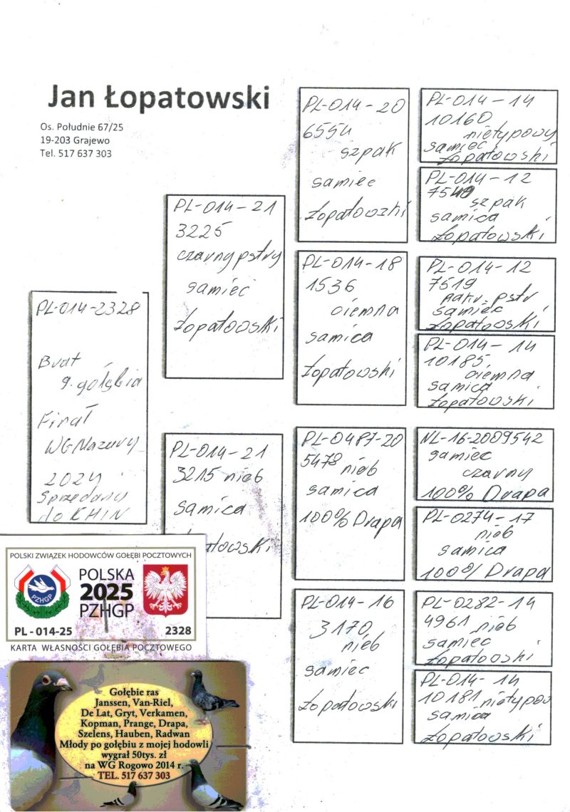 Gołąb PL-014-25-2328 - uczestnik 8 edycji OLR Mazury 2025. Ukończył cały program tegorocznej edycji. 290 miejsce z finału, 292 AS OLR Mazury.