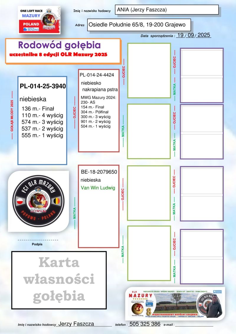 Gołąb PL-014-25-3940 - uczestnik 8 edycji OLR Mazury 2025. Ukończył cały program tegorocznej edycji. 136 miejsce z finału, 181 AS OLR Mazury.