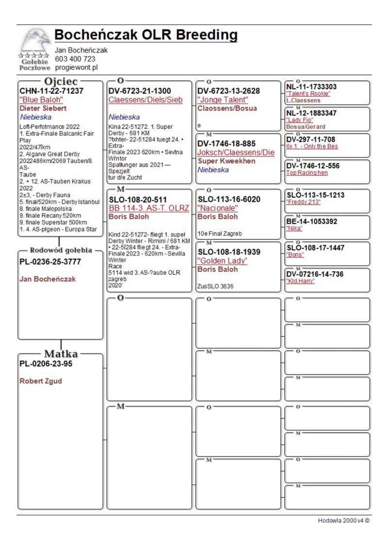 Szczegóły pochodzenia w rodowodzie. Pełne wyniki gołębia w sezonie lotowym na stronie: