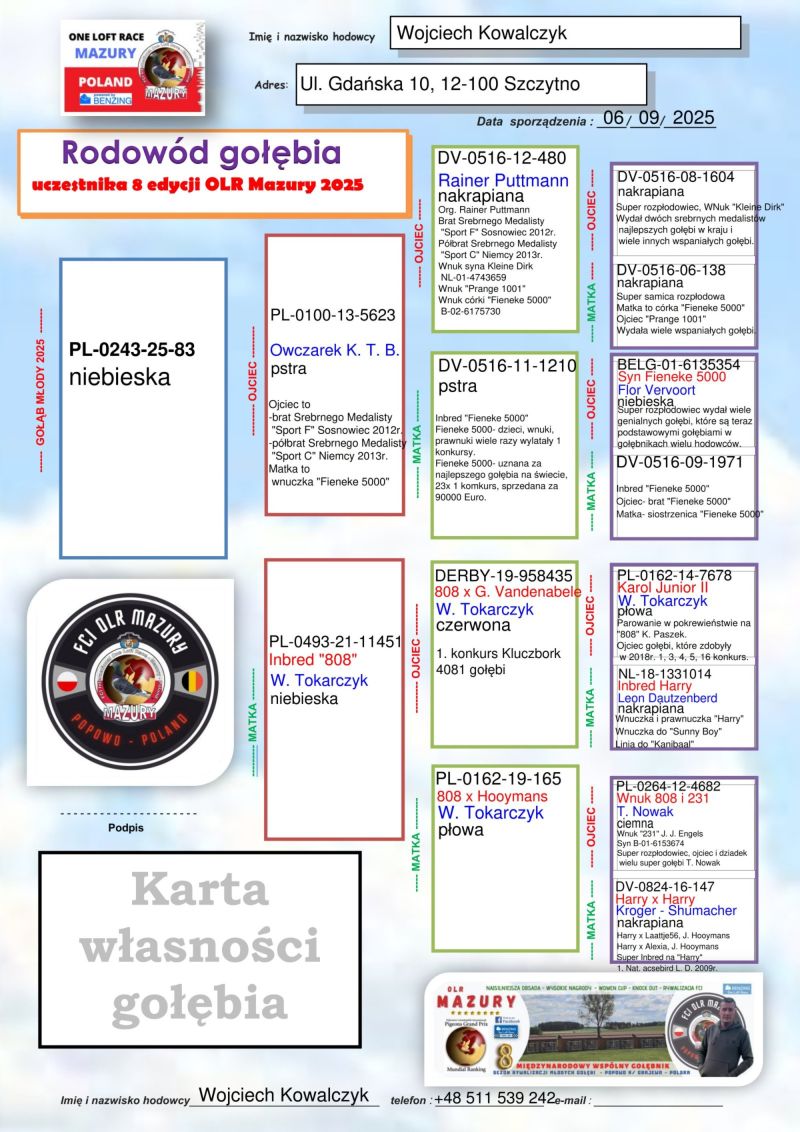 Gołąb PL-0243-25-83 - uczestnik 8 edycji OLR Mazury 2025. Ukończył cały program tegorocznej edycji. 235 miejsce z finału, 281 AS OLR Mazury.