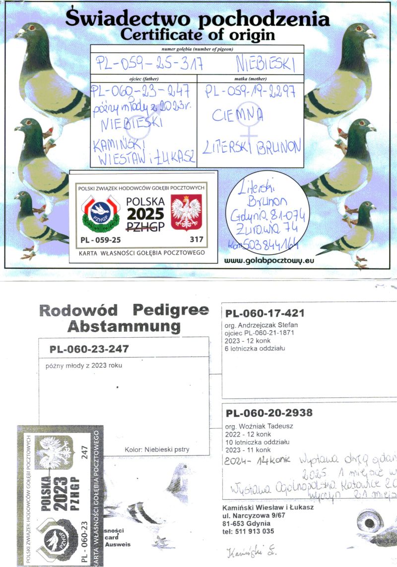 Opis: Gołąb PL-059-25-317 - uczestnik 8 edycji OLR Mazury 2025. Ukończył cały program tegorocznej edycji. 42 miejsce z finału, 150 AS OLR Mazury. Szczegóły pochodzenia w rodowodzie. Pełne wyniki gołębia w sezonie lotowym na stronie: oneloftrace.live/lofts/148/teams/4416730/pigeons/34471563 Zapraszamy do licytacji.