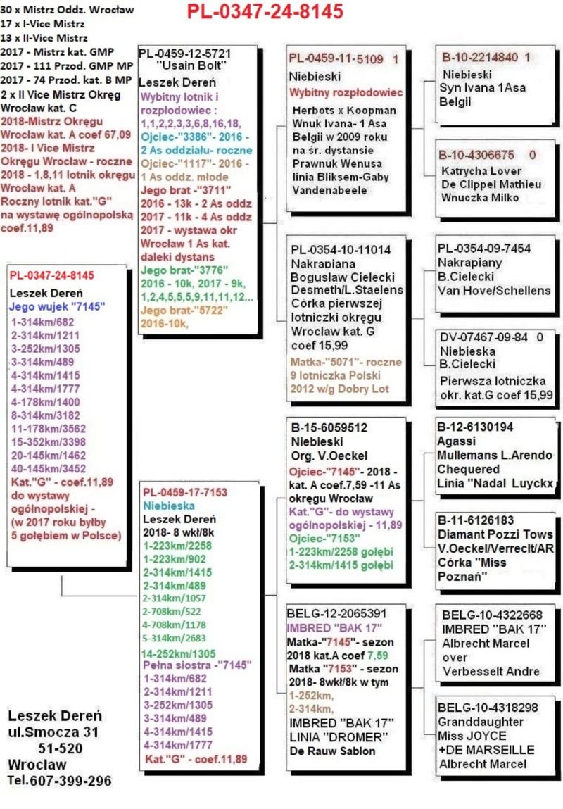 Doręczenie gołębi w dniu 11.11.2025 koszt wysyłki do 100km od mojego miejsca zamieszkania - Wrocław 70zł. Powyżej 100km - 100zł niezależnie od liczby kupionych gołębi. Tel.607-399-296 Osiągnięcia lotowe - 35 tytułów Mistrza oddziału Wrocław Sezon 2018 5x 1 gołąb w oddziele Mistrz oddziału kat.A, I Vice mistrz oddziału kat. B Mistrz Okręgu Wrocław kat.A coef.67,09 , I Vice Mistrz Okręgu Wrocław kat. roczne 1,8,11 lotnik okręgu Wrocław kat. A Roczny lotnik do kat.G na wystawę ogólnopolską coef. 11,89 (w ubiegłym sezonie lotowym byłby to 5 wynik w Polsce ) Wybrane loty : Zielona Góra 145 km, oddział włożył 3452 gołębie, koszowałem 62goł/40k : 1,2,4,17,18,20,21,23,24,35,38,40,55,56,57,67,72,74,75,85,86,itd Krosno odżańskie 178km, oddział włożył 3582 gołębie, koszowałem 57goł/40k : 1,11,12,13,15,23,33,35,39,42,43,45,50,50,58,62,67,81,94,itd... Furstenwalde 252km, oddział włożył 3398 gołębi, koszowałem 56/39k : 3,10,15,24,30,47,49,63,84,85,itd.. Michendorf 1 oddział włozył 3182gołębie, koszowałem 56/37k : 1,8,9,10,24,26,27,41,43,55,56,57,60,62,70,74,80,88,89,91,95itd... Michendorf 4 314km, oddział włożył 1415 gołębi koszowałem 20/14k :1,2,4,14,30,37,41,58,66,78itd... Najlepsze lotniki kat.A Coef. 1.17 , 6.23 , 7.59 , 16.09 , 16.99 , 18.76 , Największa wydolność % w oddziale po wszystkich lotach 53,1%. 17 razy gołąb w pierwszej dziesiątce list oddziałowej z tego 5 razy 1 gołąb. 2 As Polski kat. roczne w / g biuletynu „Dobry Lot” 5 As Polski kat. A w /g biuletynu „Dobry Lot” 13 As Polski kat . G wystawa ogólnopolska Sosnowiec 13 As Polski kat. D wystawa ogólnopolska Sosnowiec Sezon 2019 Mistrz Oddziału kat.A Okręg Wrocław 7 miejsce kat. A. Największa wydolność procentowa w oddziele - 55,7% 2018 drugi lotnik Polski w/g biuletynu dobry lot kat. roczne. Wystawa ogólnopolska Sosnowiec 2019 12 As Polski kat. G oraz 13 As Polski kat. D. Sezon 2019 – wybrane loty : Zielona Góra 145km - oddział włożył 2875 gołębi, koszowałem 33 goł/9k : 7,16,49, itd… Krosno Odrzańskie 178km - oddział włożył 2924 gołębie, koszowałem 28goł/22k : 1,2,3,12,13,14,15,16,19,24,25,26,27,28,30,46,99, itd…. 1 Seria z całości, 1 seria z 50, Klasyfikacja po dwóch lotach : 1 Miejsce gołębie typowane 2 Miejsce klasyfikacja z 50, Michendorf 1 314km – oddział włożył 2787 gołębi, koszowałem 27goł/19k : 1,8,10,11,16,17,31,42,47,48,77,78,itd. 1 Seria z całości, 1 seria z 50, 1 seria typowana, 1 seria GMP, 1 seria intermistrzostwo, 4 x 1 gołąb w oddziele.