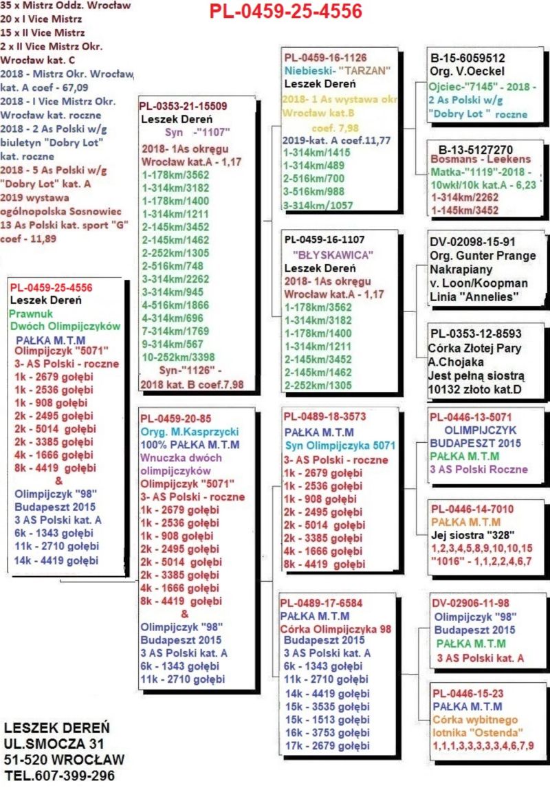 Doręczenie gołębi w dniu 11.11.2025 koszt wysyłki do 100km od mojego miejsca zamieszkania - Wrocław 70zł. Powyżej 100km - 100zł niezależnie od liczby kupionych gołębi. Tel.607-399-296 Osiągnięcia lotowe - 35 tytułów Mistrza oddziału Wrocław Sezon 2018 5x 1 gołąb w oddziele Mistrz oddziału kat.A, I Vice mistrz oddziału kat. B Mistrz Okręgu Wrocław kat.A coef.67,09 , I Vice Mistrz Okręgu Wrocław kat. roczne 1,8,11 lotnik okręgu Wrocław kat. A Roczny lotnik do kat.G na wystawę ogólnopolską coef. 11,89 (w ubiegłym sezonie lotowym byłby to 5 wynik w Polsce ) Wybrane loty : Zielona Góra 145 km, oddział włożył 3452 gołębie, koszowałem 62goł/40k : 1,2,4,17,18,20,21,23,24,35,38,40,55,56,57,67,72,74,75,85,86,itd Krosno odżańskie 178km, oddział włożył 3582 gołębie, koszowałem 57goł/40k : 1,11,12,13,15,23,33,35,39,42,43,45,50,50,58,62,67,81,94,itd... Furstenwalde 252km, oddział włożył 3398 gołębi, koszowałem 56/39k : 3,10,15,24,30,47,49,63,84,85,itd.. Michendorf 1 oddział włozył 3182gołębie, koszowałem 56/37k : 1,8,9,10,24,26,27,41,43,55,56,57,60,62,70,74,80,88,89,91,95itd... Michendorf 4 314km, oddział włożył 1415 gołębi koszowałem 20/14k :1,2,4,14,30,37,41,58,66,78itd... Najlepsze lotniki kat.A Coef. 1.17 , 6.23 , 7.59 , 16.09 , 16.99 , 18.76 , Największa wydolność % w oddziale po wszystkich lotach 53,1%. 17 razy gołąb w pierwszej dziesiątce list oddziałowej z tego 5 razy 1 gołąb. 2 As Polski kat. roczne w / g biuletynu „Dobry Lot” 5 As Polski kat. A w /g biuletynu „Dobry Lot” 13 As Polski kat . G wystawa ogólnopolska Sosnowiec 13 As Polski kat. D wystawa ogólnopolska Sosnowiec Sezon 2019 Mistrz Oddziału kat.A Okręg Wrocław 7 miejsce kat. A. Największa wydolność procentowa w oddziele - 55,7% 2018 drugi lotnik Polski w/g biuletynu dobry lot kat. roczne. Wystawa ogólnopolska Sosnowiec 2019 12 As Polski kat. G oraz 13 As Polski kat. D. Sezon 2019 – wybrane loty : Zielona Góra 145km - oddział włożył 2875 gołębi, koszowałem 33 goł/9k : 7,16,49, itd… Krosno Odrzańskie 178km - oddział włożył 2924 gołębie, koszowałem 28goł/22k : 1,2,3,12,13,14,15,16,19,24,25,26,27,28,30,46,99, itd…. 1 Seria z całości, 1 seria z 50, Klasyfikacja po dwóch lotach : 1 Miejsce gołębie typowane 2 Miejsce klasyfikacja z 50, Michendorf 1 314km – oddział włożył 2787 gołębi, koszowałem 27goł/19k : 1,8,10,11,16,17,31,42,47,48,77,78,itd. 1 Seria z całości, 1 seria z 50, 1 seria typowana, 1 seria GMP, 1 seria intermistrzostwo, 4 x 1 gołąb w oddziele.