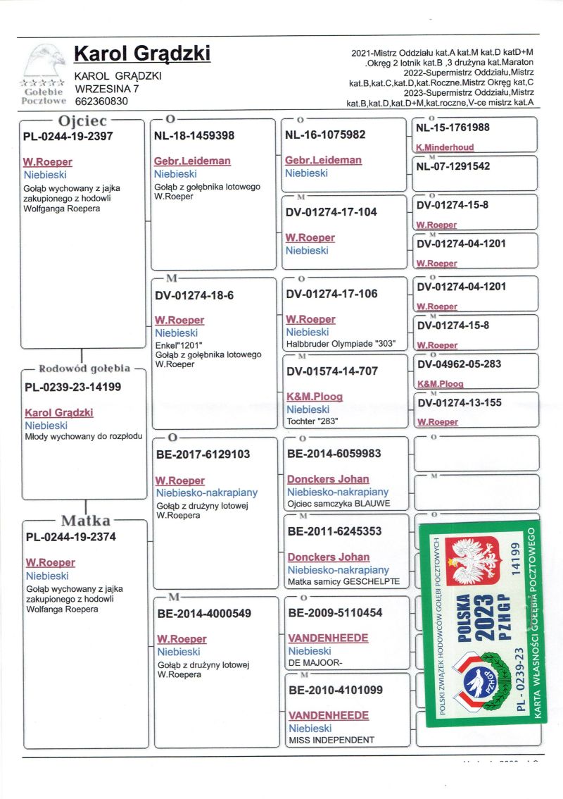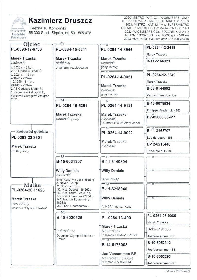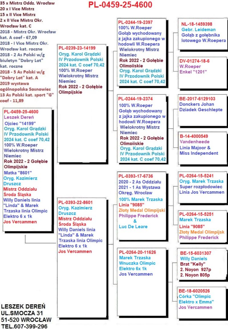 Doręczenie gołębi w dniu 11.11.2025 koszt wysyłki do 100km od mojego miejsca zamieszkania - Wrocław 70zł. Powyżej 100km - 100zł niezależnie od liczby kupionych gołębi. Tel.607-399-296 Osiągnięcia lotowe - 35 tytułów Mistrza oddziału Wrocław Sezon 2018 5x 1 gołąb w oddziele Mistrz oddziału kat.A, I Vice mistrz oddziału kat. B Mistrz Okręgu Wrocław kat.A coef.67,09 , I Vice Mistrz Okręgu Wrocław kat. roczne 1,8,11 lotnik okręgu Wrocław kat. A Roczny lotnik do kat.G na wystawę ogólnopolską coef. 11,89 (w ubiegłym sezonie lotowym byłby to 5 wynik w Polsce ) Wybrane loty : Zielona Góra 145 km, oddział włożył 3452 gołębie, koszowałem 62goł/40k : 1,2,4,17,18,20,21,23,24,35,38,40,55,56,57,67,72,74,75,85,86,itd Krosno odżańskie 178km, oddział włożył 3582 gołębie, koszowałem 57goł/40k : 1,11,12,13,15,23,33,35,39,42,43,45,50,50,58,62,67,81,94,itd... Furstenwalde 252km, oddział włożył 3398 gołębi, koszowałem 56/39k : 3,10,15,24,30,47,49,63,84,85,itd.. Michendorf 1 oddział włozył 3182gołębie, koszowałem 56/37k : 1,8,9,10,24,26,27,41,43,55,56,57,60,62,70,74,80,88,89,91,95itd... Michendorf 4 314km, oddział włożył 1415 gołębi koszowałem 20/14k :1,2,4,14,30,37,41,58,66,78itd... Najlepsze lotniki kat.A Coef. 1.17 , 6.23 , 7.59 , 16.09 , 16.99 , 18.76 , Największa wydolność % w oddziale po wszystkich lotach 53,1%. 17 razy gołąb w pierwszej dziesiątce list oddziałowej z tego 5 razy 1 gołąb. 2 As Polski kat. roczne w / g biuletynu „Dobry Lot” 5 As Polski kat. A w /g biuletynu „Dobry Lot” 13 As Polski kat . G wystawa ogólnopolska Sosnowiec 13 As Polski kat. D wystawa ogólnopolska Sosnowiec Sezon 2019 Mistrz Oddziału kat.A Okręg Wrocław 7 miejsce kat. A. Największa wydolność procentowa w oddziele - 55,7% 2018 drugi lotnik Polski w/g biuletynu dobry lot kat. roczne. Wystawa ogólnopolska Sosnowiec 2019 12 As Polski kat. G oraz 13 As Polski kat. D. Sezon 2019 – wybrane loty : Zielona Góra 145km - oddział włożył 2875 gołębi, koszowałem 33 goł/9k : 7,16,49, itd… Krosno Odrzańskie 178km - oddział włożył 2924 gołębie, koszowałem 28goł/22k : 1,2,3,12,13,14,15,16,19,24,25,26,27,28,30,46,99, itd…. 1 Seria z całości, 1 seria z 50, Klasyfikacja po dwóch lotach : 1 Miejsce gołębie typowane 2 Miejsce klasyfikacja z 50, Michendorf 1 314km – oddział włożył 2787 gołębi, koszowałem 27goł/19k : 1,8,10,11,16,17,31,42,47,48,77,78,itd. 1 Seria z całości, 1 seria z 50, 1 seria typowana, 1 seria GMP, 1 seria intermistrzostwo, 4 x 1 gołąb w oddziele.
