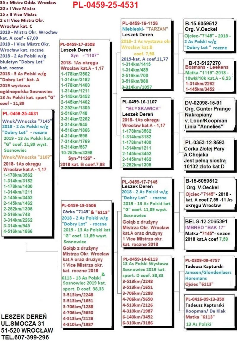 Doręczenie gołębi w dniu 11.11.2025 koszt wysyłki do 100km od mojego miejsca zamieszkania - Wrocław 70zł. Powyżej 100km - 100zł niezależnie od liczby kupionych gołębi. Tel.607-399-296 Osiągnięcia lotowe - 35 tytułów Mistrza oddziału Wrocław Sezon 2018 5x 1 gołąb w oddziele Mistrz oddziału kat.A, I Vice mistrz oddziału kat. B Mistrz Okręgu Wrocław kat.A coef.67,09 , I Vice Mistrz Okręgu Wrocław kat. roczne 1,8,11 lotnik okręgu Wrocław kat. A Roczny lotnik do kat.G na wystawę ogólnopolską coef. 11,89 (w ubiegłym sezonie lotowym byłby to 5 wynik w Polsce ) Wybrane loty : Zielona Góra 145 km, oddział włożył 3452 gołębie, koszowałem 62goł/40k : 1,2,4,17,18,20,21,23,24,35,38,40,55,56,57,67,72,74,75,85,86,itd Krosno odżańskie 178km, oddział włożył 3582 gołębie, koszowałem 57goł/40k : 1,11,12,13,15,23,33,35,39,42,43,45,50,50,58,62,67,81,94,itd... Furstenwalde 252km, oddział włożył 3398 gołębi, koszowałem 56/39k : 3,10,15,24,30,47,49,63,84,85,itd.. Michendorf 1 oddział włozył 3182gołębie, koszowałem 56/37k : 1,8,9,10,24,26,27,41,43,55,56,57,60,62,70,74,80,88,89,91,95itd... Michendorf 4 314km, oddział włożył 1415 gołębi koszowałem 20/14k :1,2,4,14,30,37,41,58,66,78itd... Najlepsze lotniki kat.A Coef. 1.17 , 6.23 , 7.59 , 16.09 , 16.99 , 18.76 , Największa wydolność % w oddziale po wszystkich lotach 53,1%. 17 razy gołąb w pierwszej dziesiątce list oddziałowej z tego 5 razy 1 gołąb. 2 As Polski kat. roczne w / g biuletynu „Dobry Lot” 5 As Polski kat. A w /g biuletynu „Dobry Lot” 13 As Polski kat . G wystawa ogólnopolska Sosnowiec 13 As Polski kat. D wystawa ogólnopolska Sosnowiec Sezon 2019 Mistrz Oddziału kat.A Okręg Wrocław 7 miejsce kat. A. Największa wydolność procentowa w oddziele - 55,7% 2018 drugi lotnik Polski w/g biuletynu dobry lot kat. roczne. Wystawa ogólnopolska Sosnowiec 2019 12 As Polski kat. G oraz 13 As Polski kat. D. Sezon 2019 – wybrane loty : Zielona Góra 145km - oddział włożył 2875 gołębi, koszowałem 33 goł/9k : 7,16,49, itd… Krosno Odrzańskie 178km - oddział włożył 2924 gołębie, koszowałem 28goł/22k : 1,2,3,12,13,14,15,16,19,24,25,26,27,28,30,46,99, itd…. 1 Seria z całości, 1 seria z 50, Klasyfikacja po dwóch lotach : 1 Miejsce gołębie typowane 2 Miejsce klasyfikacja z 50, Michendorf 1 314km – oddział włożył 2787 gołębi, koszowałem 27goł/19k : 1,8,10,11,16,17,31,42,47,48,77,78,itd. 1 Seria z całości, 1 seria z 50, 1 seria typowana, 1 seria GMP, 1 seria intermistrzostwo, 4 x 1 gołąb w oddziele.