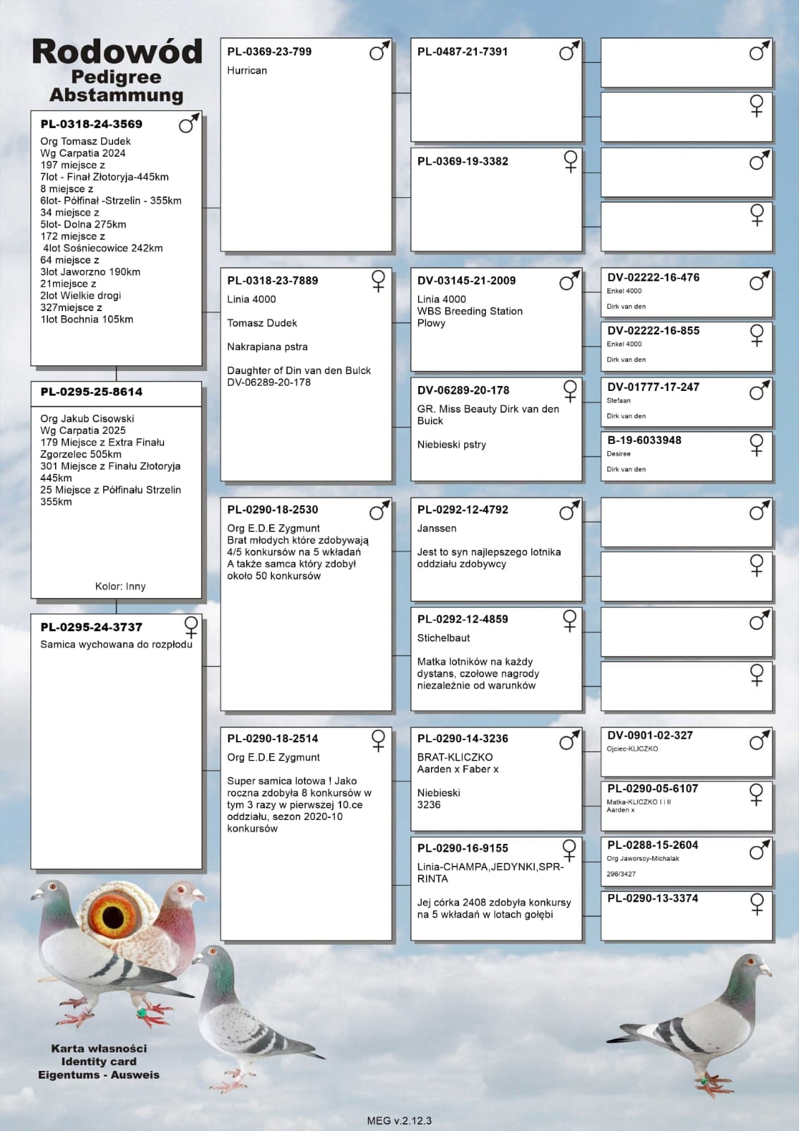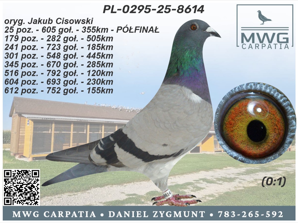 Opis: Gołąbek z MWG Carpatia, po całym sezonie lotowym 2025. Drużyna: Jakub Cisowski, 25 z 355 km i 179 z 505 km. Zorganizowaliśmy 9 lotów treningowych do 92km oraz 7 lotów konkursowych od 105 do 445km, a także ekstra finał z odległości 505km. Ptaki łącznie zrobiły 2153km, a niektóre nawet 2658km. Cały sezon był ciężki i wymagający, więc wszystkie ptaki, które sobie poradziły są warte i cenne uwagi. Więcej informacji pod numerem 783-265-592. Transport 100 zł do 2szt. Do 3-4szt - 150zł. Powyżej 5szt - 200zł. Zapraszamy do udziału w edycji 2026 :)
